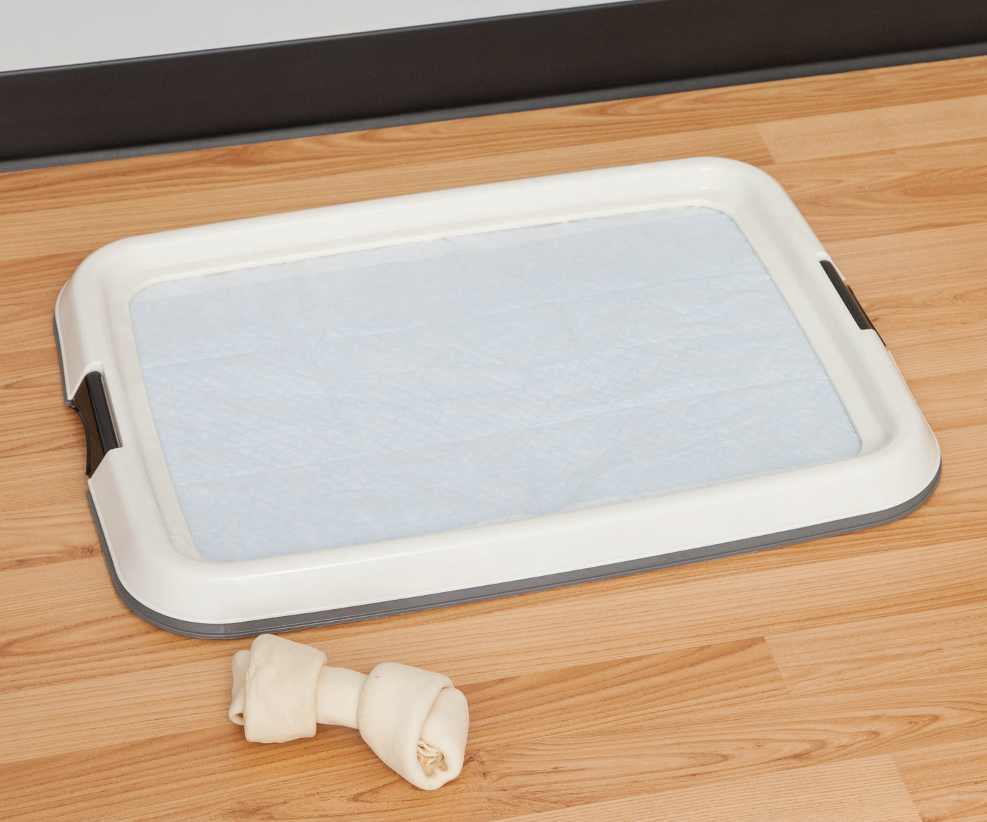 Q: How does the IRIS USA Pee Pad Holder prevent slipping and sliding?A: This pee pad holder features non-skid rubber feet that keep the tray steady, providing secure footing for your dog during training sessions and preventing the tray from moving around.