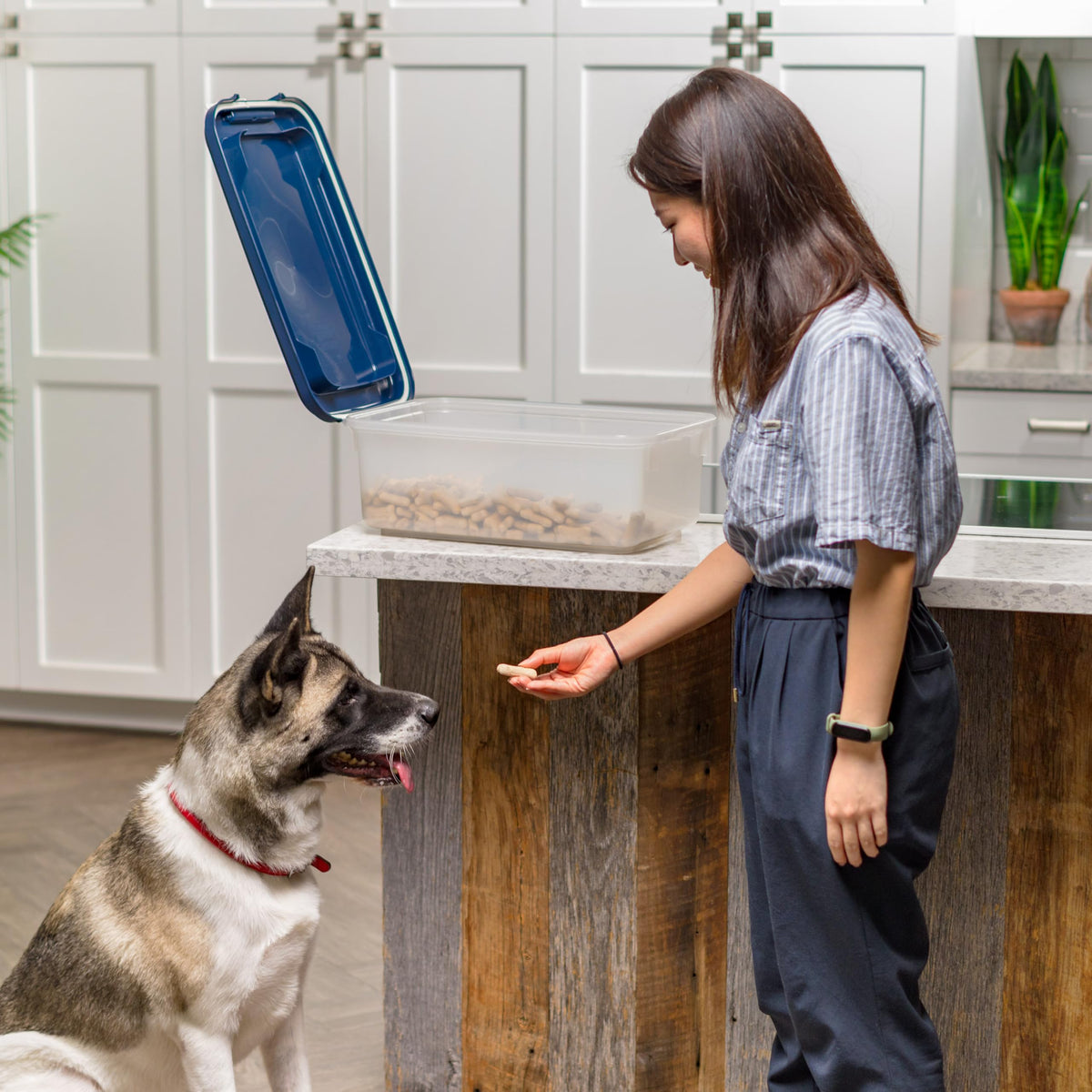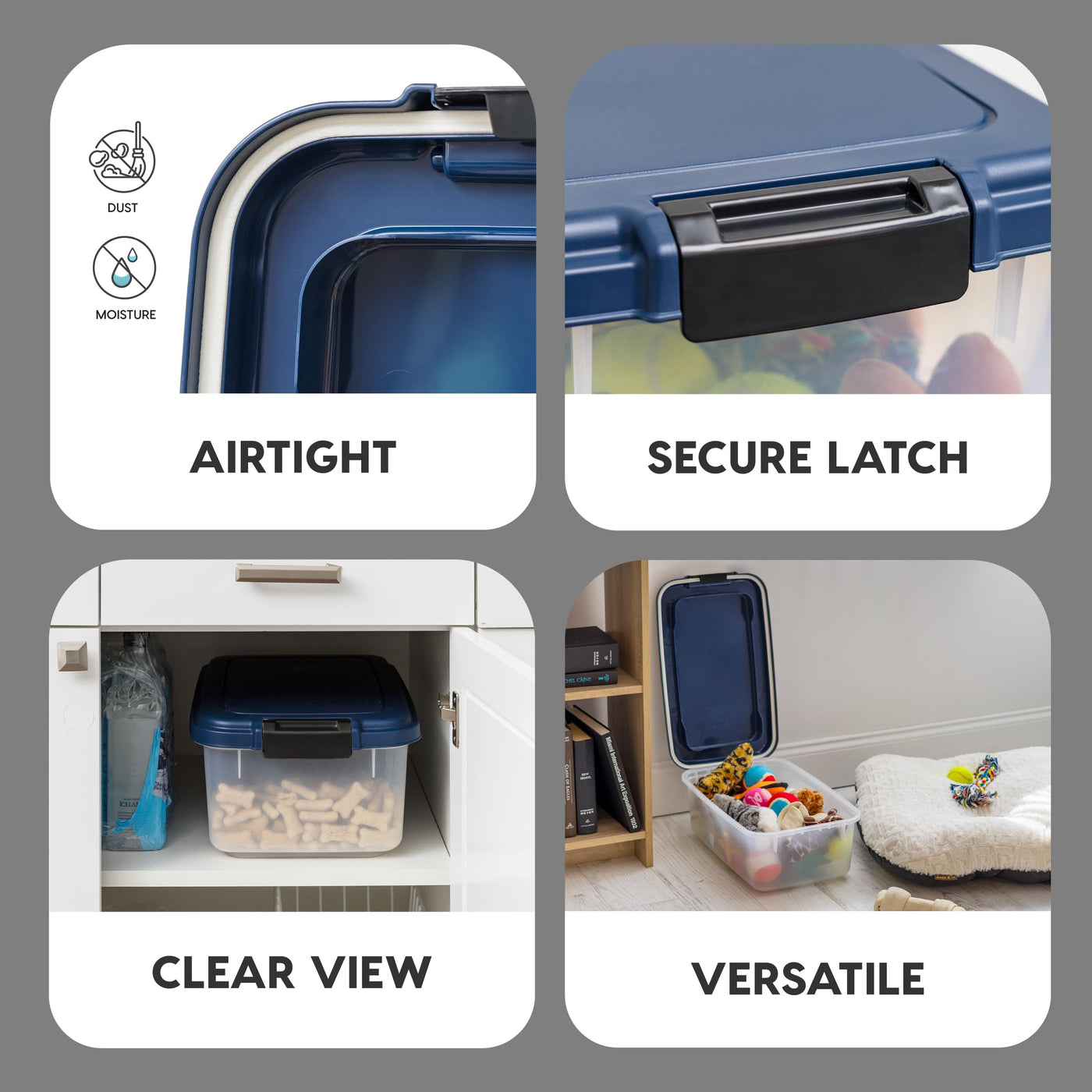 IRIS plastic airtight container is perfect for storing dog food, cat food, or any other dry pet food or treat you wish to store. The 14 Pound sealed storage container features a foam seal and snap lock latches to keep pet food fresh and keep moisture out. Designed as pet food bins, these BPA free airtight storage bins offer many other uses as well, such as leash and toy storage, pellet storage, grain storage, birdseed storage, cat litter storage, or even as a charcoal container. This IRIS airtight pet food container is translucent, versatile, functional, and can be used and stored in any area of the house.