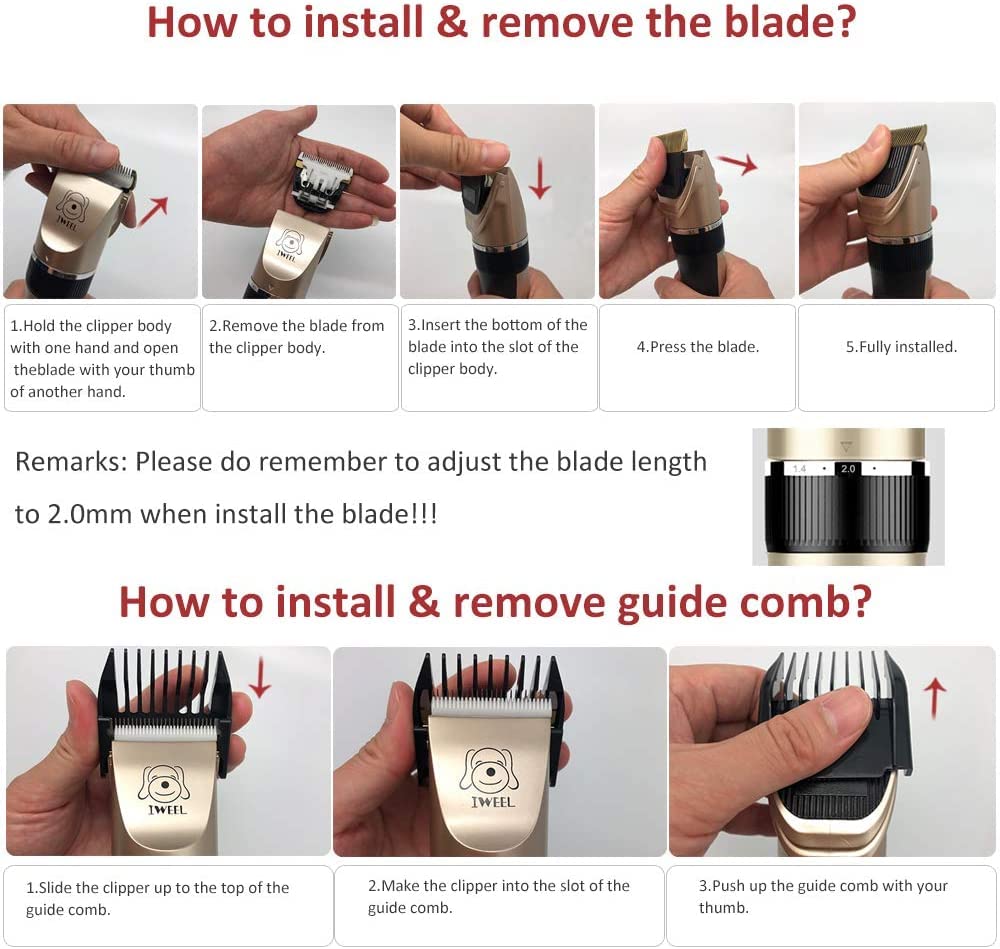 WATERPROOF!!!IPX4 water resistant. Can be rinsed under running water. Do not submerge completely in water. Precision motor, Low vibration, Low noise and Light weight design, reduce noise to below 60db (equal to ambient noise),which helps pets feel at ease and not afraid of hair cutting any more. Target Audience: Dogs Cats Horses Rabbits and Other Small Animals SPECIFICATIONS Operating Voltage: 3.7V Shaft Material: Abrasion resistant copper Battery Type: High performance environment-friendly battery Charging Time: About 4-5 hours Using Time After Full Charged: About 2.5 hours This pet clippers are made with worldwide voltage, it can be used at 110-240V. You can connect it to any PC or any wall USB adapter that works on your voltage. INCLUDES 1*Professional Pet Clipper 1*Stainless Steel Comb 1*Stainless Steel Scissors 6*Guide Combs (3mm, 6mm, 9mm, 12mm, left and right comb) 1*USB Cord 1*Cleaning Brush 1*User Manual Please feel free to let us know if you have any question about our product. You have no risk to try.