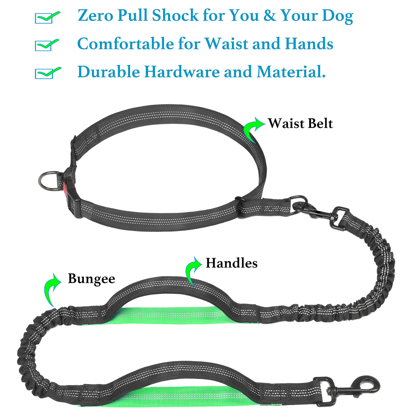 Q: How does the dual-handle feature work?A: The dual-handle feature allows you to maintain total control of your dog while running or walking. The waist handle provides hands-free convenience, while the traffic handle offers tighter control when needed.