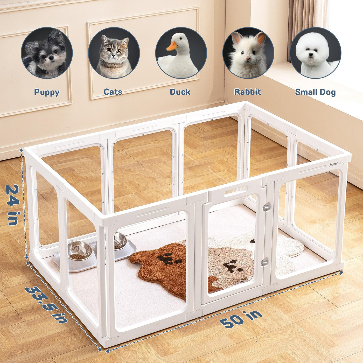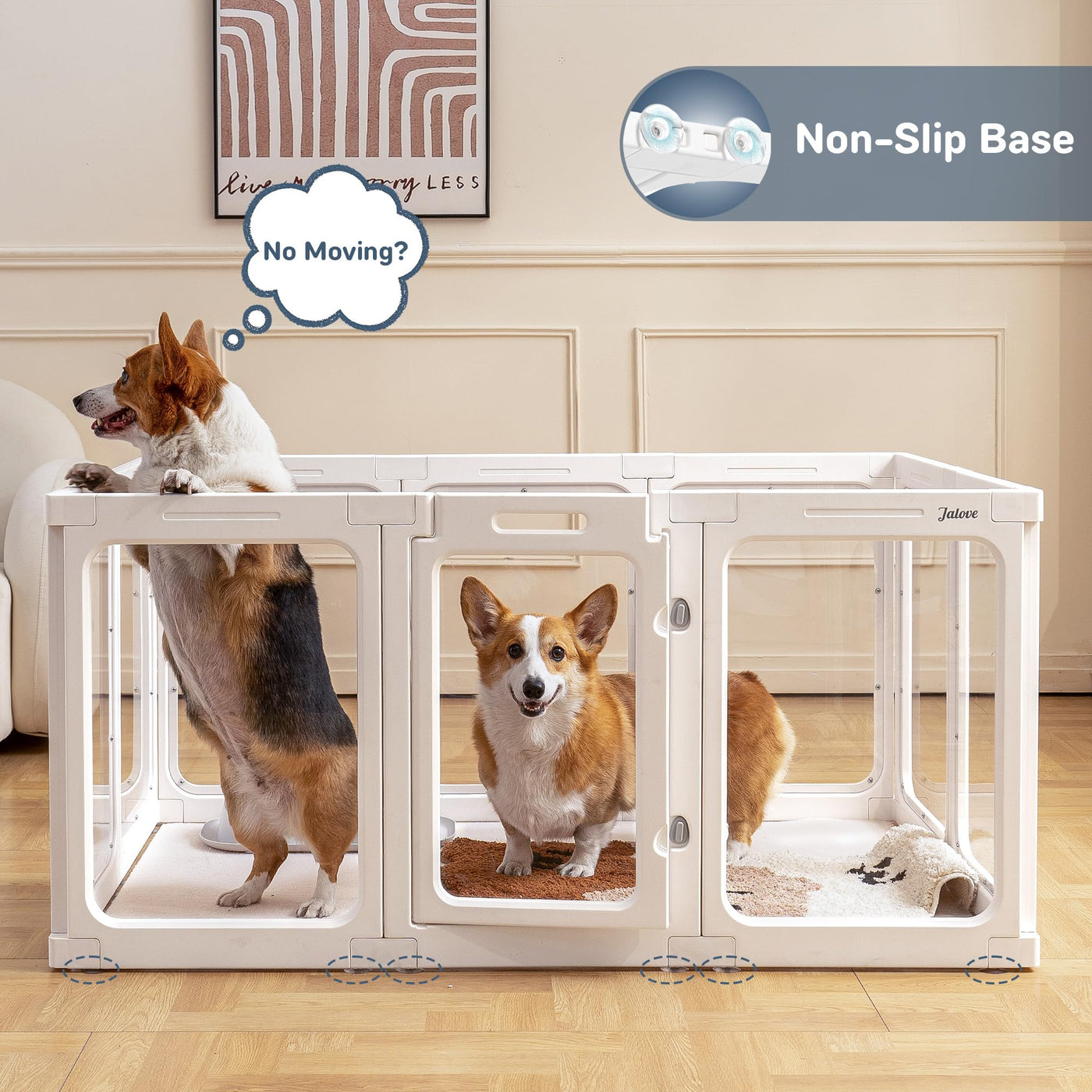 Discover The Jalove Modern Pet Playpen, Crafted With Transparent Acrylic Panels For An Indoor Puppy Play Pen That Offers A Clear View And Alleviates Pet Stress. Assembly Is Quick And Tool-Free, Making Setup A Snap. Built With Durable Hdpe & Abs Materials And Equipped With Suction Cups, It Provides A Sturdy And Stable Playpen For Dogs Indoor Small. Perfect For Various Pets, Including Small Dogs, This Acrylic Dog Playpen Is Easy To Clean And Expandable To Fit Your Needs. Have Questions? Our Customer Support Stands By To Assist. Your Satisfaction Is Our Priority