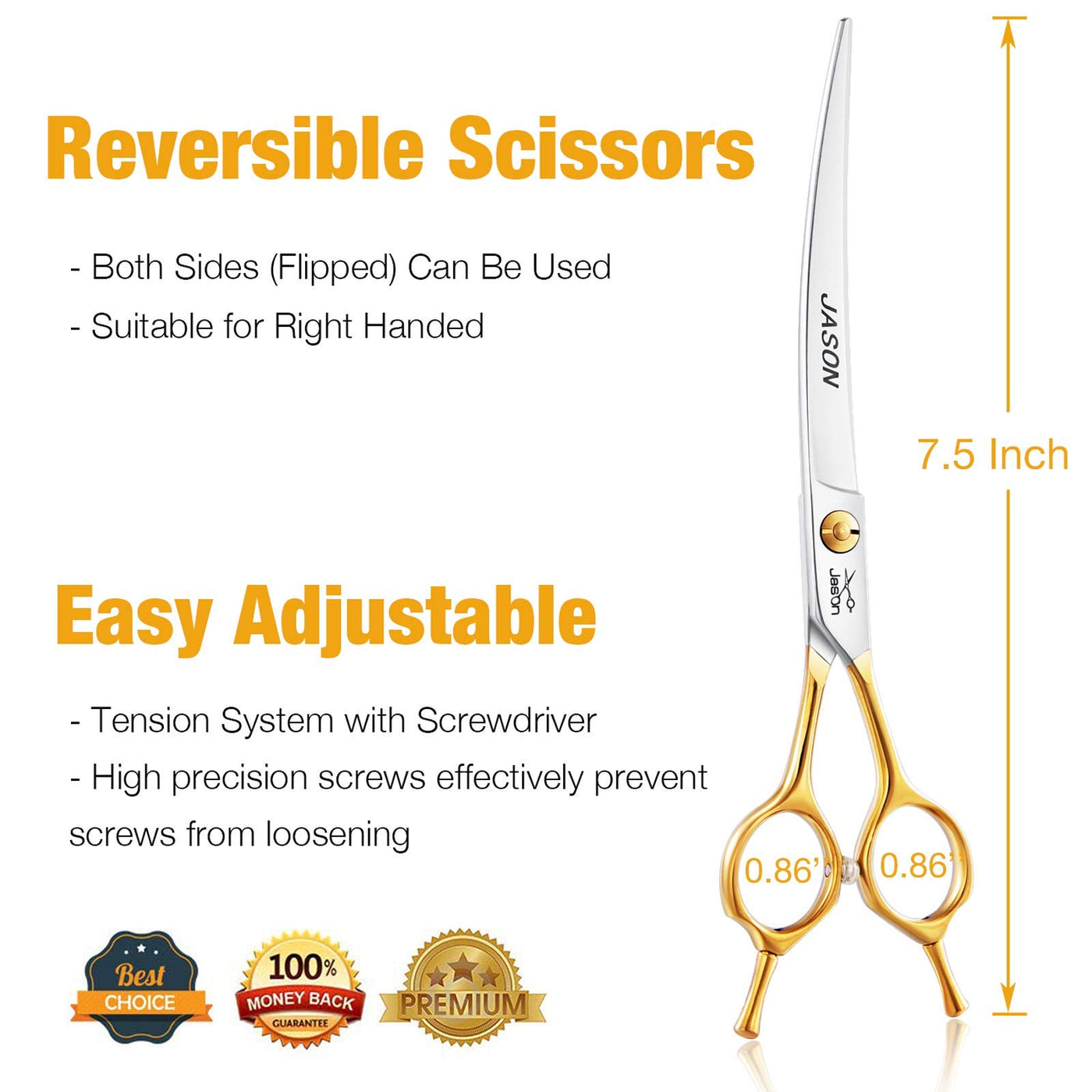 Q: What are the key features of the JASON 7.5" Curved Dog Grooming Scissors?A: The JASON 7.5" Curved Dog Grooming Scissors feature razor-sharp convex edge blades crafted from high-quality Japanese 440C stainless steel. They are designed for both right and left-handed groomers with a reversible handle, making them versatile for various grooming tasks. The lightweight and ergonomic design ensures comfort and ease of use, perfect for both beginners and experienced groomers.