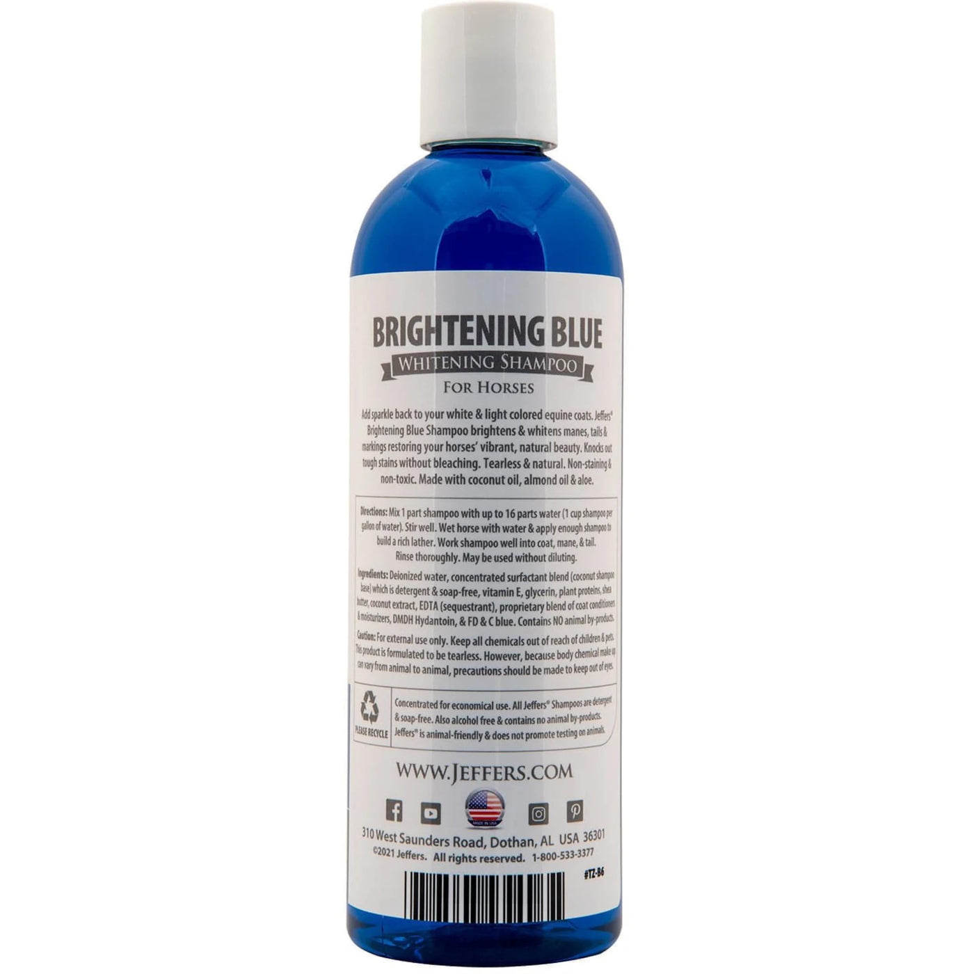 Jeffers Equine Brightening Blue Shampoo Is The Ultimate Choice For Whitening, Brightening, And Revitalizing Your Horse'S Coat, Mane, Tail, And Markings. Crafted With Natural Ingredients Like Coconut Oil, Almond Oil, And Aloe, This Gentle Yet Powerful Formula Is Tearless, Non-Toxic, Soap Free And Detergent Free And Safe For Horses Of All Breeds, Sizes, And Colors. It Effectively Removes Tough Stains, Enhances Natural Shine, And Restores Vibrant White And Light Colored Coats Without Bleaching Or Damaging The Hair. Perfect For Daily Grooming, Show Preparation, Or Tackling Stubborn Dirt, It Leaves Your Horse Looking Its Absolute Best With A Clean, Soft, And Sparkling Coat. The Non-Staining Formula Is Easy To Use - Dilute One Part Shampoo With Up To 16 Parts Water (1 Cup Shampoo Per Gallon) Or Apply Undiluted For A Deeper Clean. Work Into A Rich Lather, Massage Thoroughly Into The Coat, Mane, And Tail, Then Rinse Completely For A Dazzling Finish. Available In 16 Oz, 32 Oz, And 1 Gallon Sizes, It'S Perfect For Every Equestrian'S Cleaning And Grooming Routine.