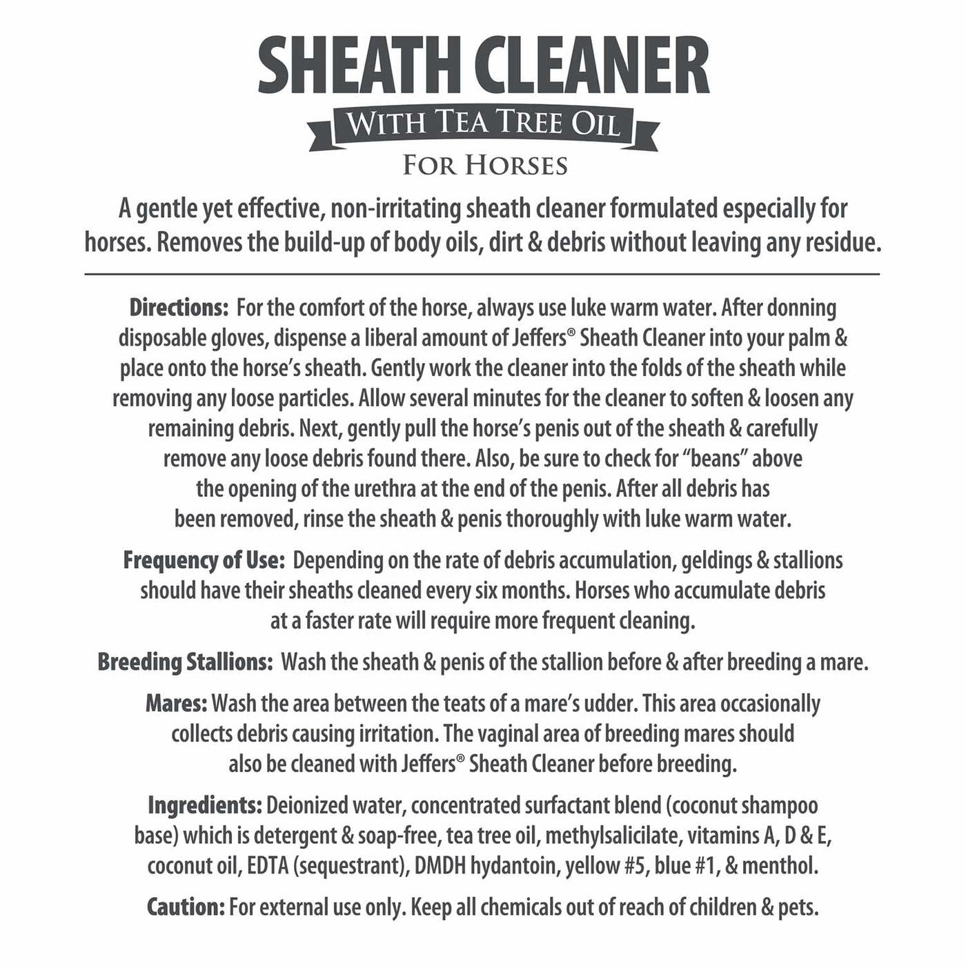 Jeffers Equine Sheath Cleaner For Horses Is A Gentle, Non-Irritating Cleanser Specifically Formulated To Remove Body Oils, Dirt, And Debris Without Leaving Any Residue. Designed For Equine Hygiene, This Ph-Balanced Formula Is Enriched With Tea Tree Oil And Natural Aloe Vera To Soothe And Condition Sensitive Areas. It Effectively Cleanses The Sheath Of Geldings And Stallions, Promoting Comfort And Cleanliness. Additionally, It Can Be Used To Prepare A Mare'S Vaginal Area Before Breeding. For Best Results, Always Use Lukewarm Water For Your Horses Comfort. Wearing Disposable Gloves, Apply A Generous Amount Of Sheath Cleaner To Your Palm And Gently Work It Into The Folds Of The Sheath, Loosening And Removing Accumulated Debris. Allow Several Minutes For Deep Penetration Before Rinsing Thoroughly. Sheath Cleaning Is Recommended Every Six Months Or As Needed. Breeding Stallions Should Be Cleaned Before And After Mating. Essential For Equine Grooming, This Cleaner Ensures Optimal Hygiene And Comfort For Horses Of All Breeds.
