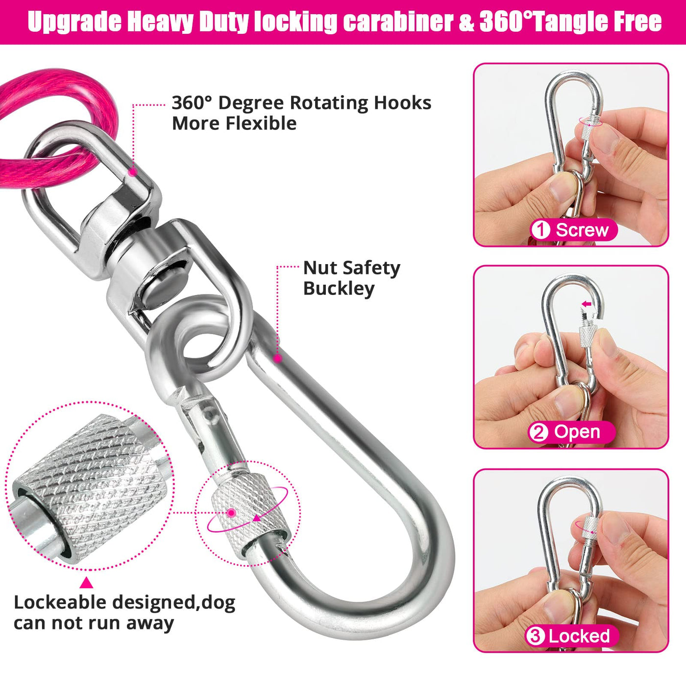 Q: Can this dog tie out cable prevent tangling during use?A: Yes, the cable features a 360° tangle-free swivel hook, allowing your dog to move freely without the risk of tangling.
