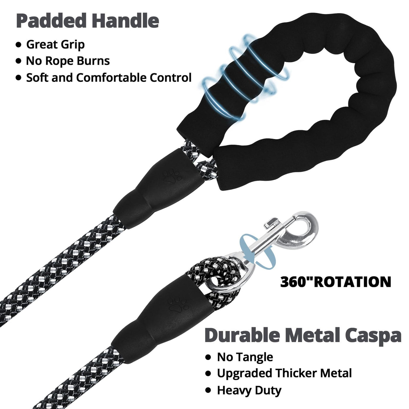 Q: Is the leash comfortable to hold during long walks?A: Yes, the leash features an ergonomic foam handle that provides a comfortable grip and helps prevent rope burn during extended use.