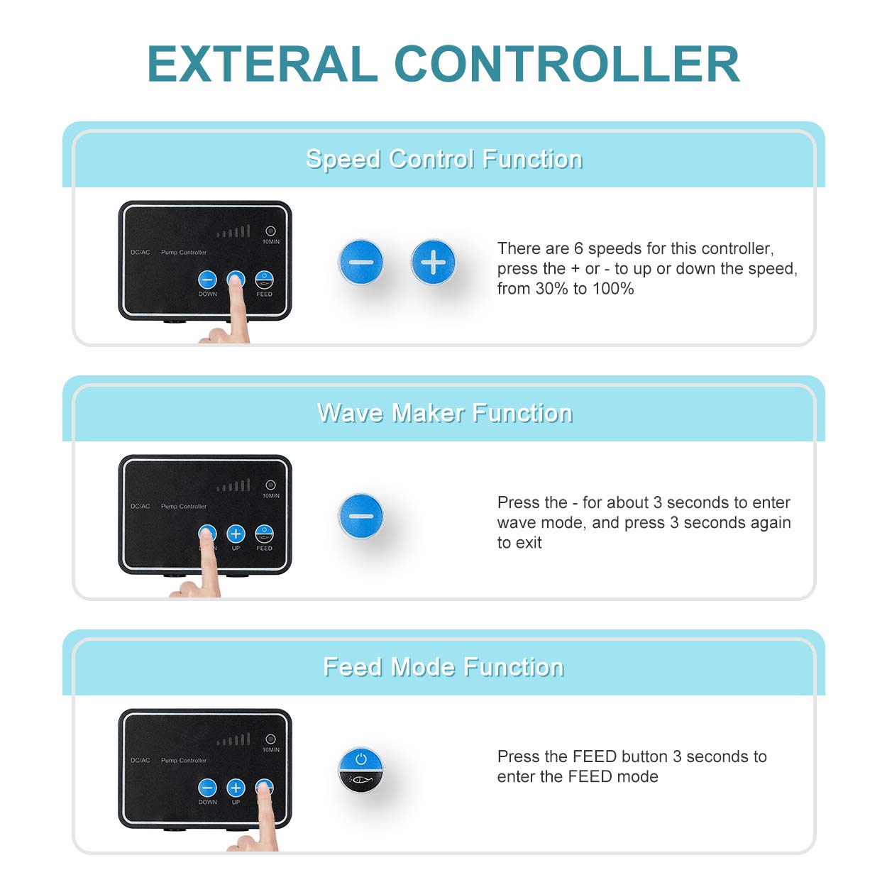 Specifications:800gPH Max flow aquarium pump EcO 28W Dc24V return pump 125 feet max liftpump dimension (L*Wx*H):54*26*34 inchesNOTE :The data of max flow mean the flow when use the largest nozzle at 0 ft lift Dc controllable water pump:6 speed adjustable control the flow from 30% to 100% of max flow with 10 minutes feeding mode and wave maker function Ultra quiet aquarium water pump:used seal impeller and ceramic shaft efficient and quiet operation nosie level lower than 30 dba Auto shut off protection return pump: the pump will automatically shut off when the pump run dry or blockedNOTE:please check the light status of controller and power supply if the pump dont work and check the user manual for reference Wide applicaion Dc pump: can be used as salt water or fresh water aquarium sump pump fountain pump hydroponics pump and waterfall pumpcan be used as externalinline or submersible pump