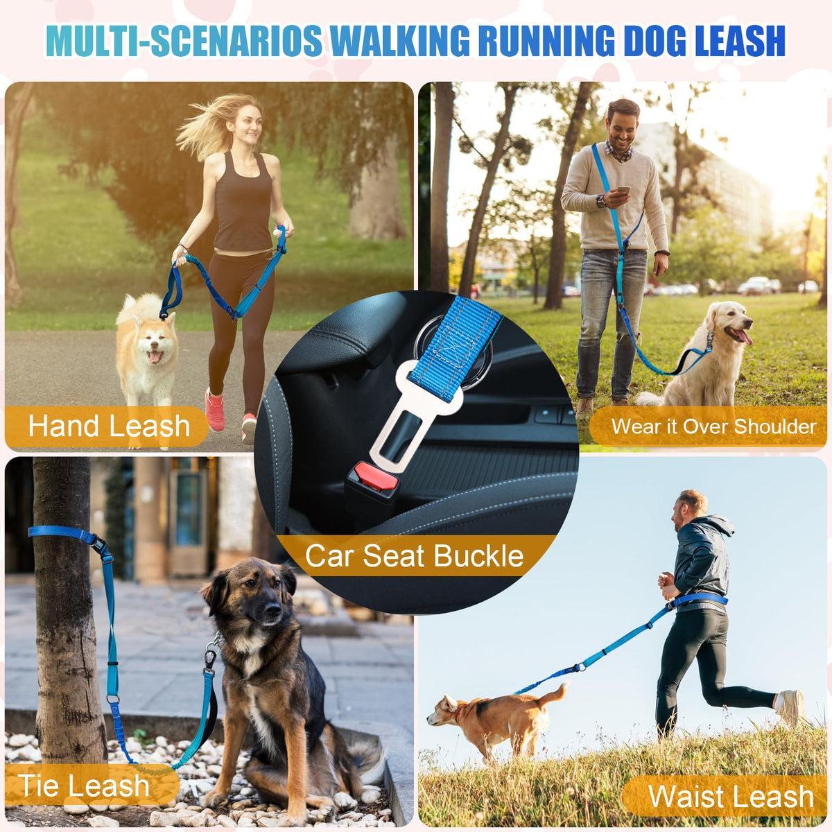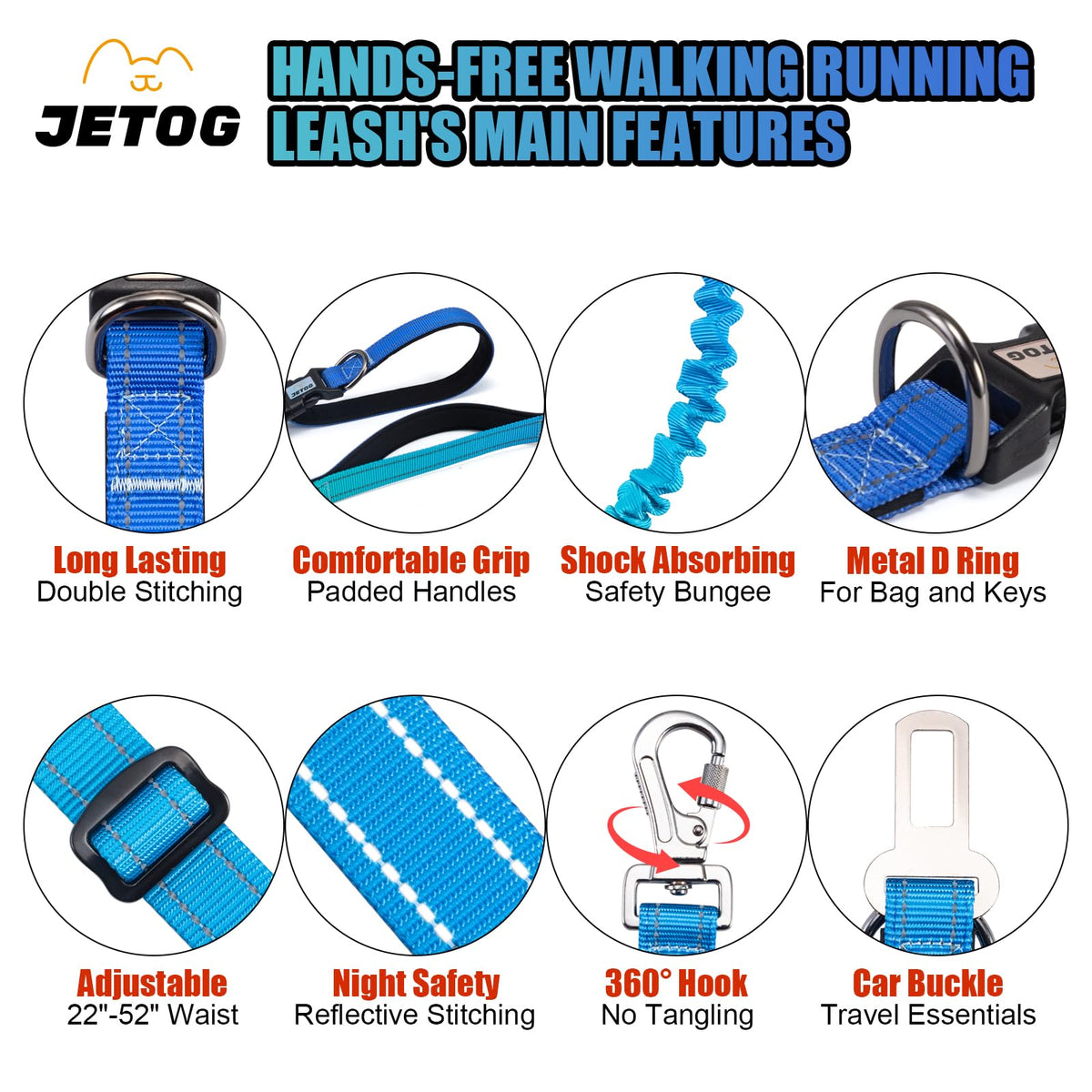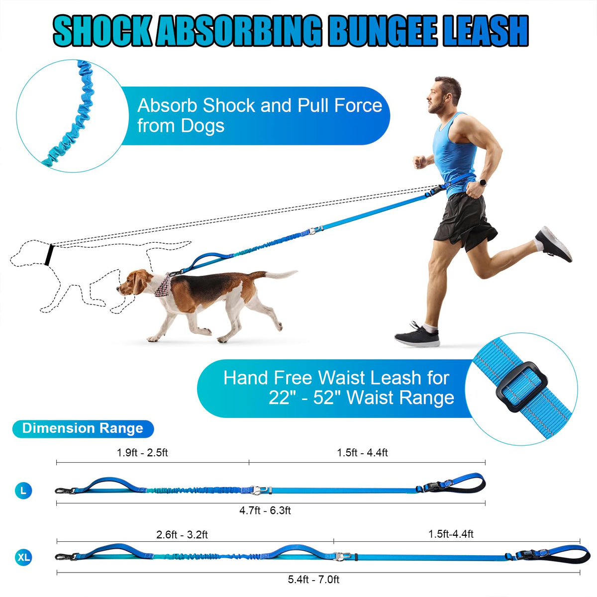 Jetog Heavy Duty Hands Free Dog Leash, 4-6 Ft Reflective Adjustable Waist Dog Leash Belt With Padded Handles, Shock Absorbing Bungee And Car Seat Belt Leashwhy Choose Jetog Hands Free Dog Leash?1. Adjustable Hands Free Dog Leash: With 22''-52'' Waist Range And 4.7-6.3 Ft Totaly Lenth Range Multifunctional Hands Free Dog Leash Works Well As A Waist Leash, Cross-Body Leash And Basic Hand Leash;2. Highly Reflective Leash: Double Reflective Tapes Keep High Visibility At Night For Safety;3. Safety Car Belt Buckle: Dog Leash Builts In A Seat Belt Clip Closer To The Top Handle For Car Rides; 4. Heavy Duty Bungee Dog Leash: Dog Collar With Plastic Buckles Much More Lighter Than Metal Ones, Providing Enough Comrfort For Your Lovely Dog;5. 2025 New Style Of Gradient Color Design: Ombre Coloring Make The Appearance Of The Collar Very Sophisticated, Your Pets Will Love It! Specification:1. Size: L - 1'' Width, 22-52'' Waist Range, 4.7-6.3 Ft Totally Length Range2. Weight: L - Weight: 8.9 Oz3. Material: Nylon+ Aluminum Alloy+ Abs Plasticmaintenance1. Handwash With Cold Water And Mild Soap.2. Keep Away From Fire.Jetog'S Service1. 24 Hours Message Response Service.2. 1 Year Warranty.