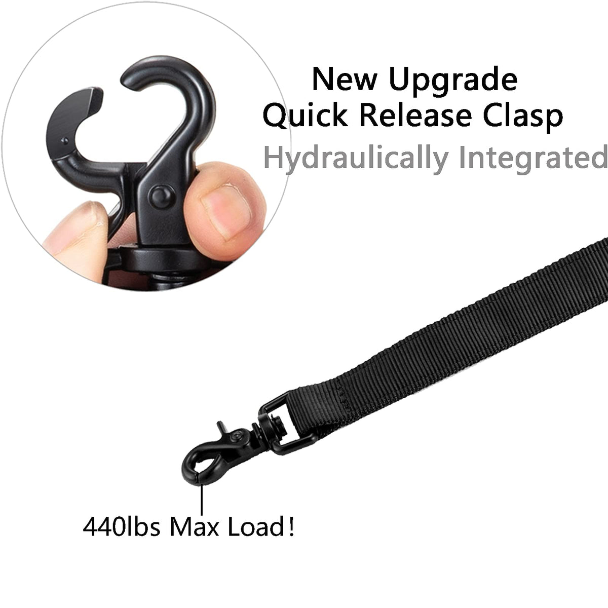 Features: *Material:It's made out of high quality 1000D nylon materials with the durable UTX metal latch that connects to your dog's collar/harness. *Two EVA Padded Handles Leads your dog, one for traffic and the other one for walking, the added control handle makes it easy to restrain your dog from a point closer to the harness. *Elastic Stretch :The elastic stretch allows the leash to expand by a few inches allowing your pet to move a little further, and it also acts to dampen the shock if your dog suddenly pulls hard and runs (good for you and your pet).