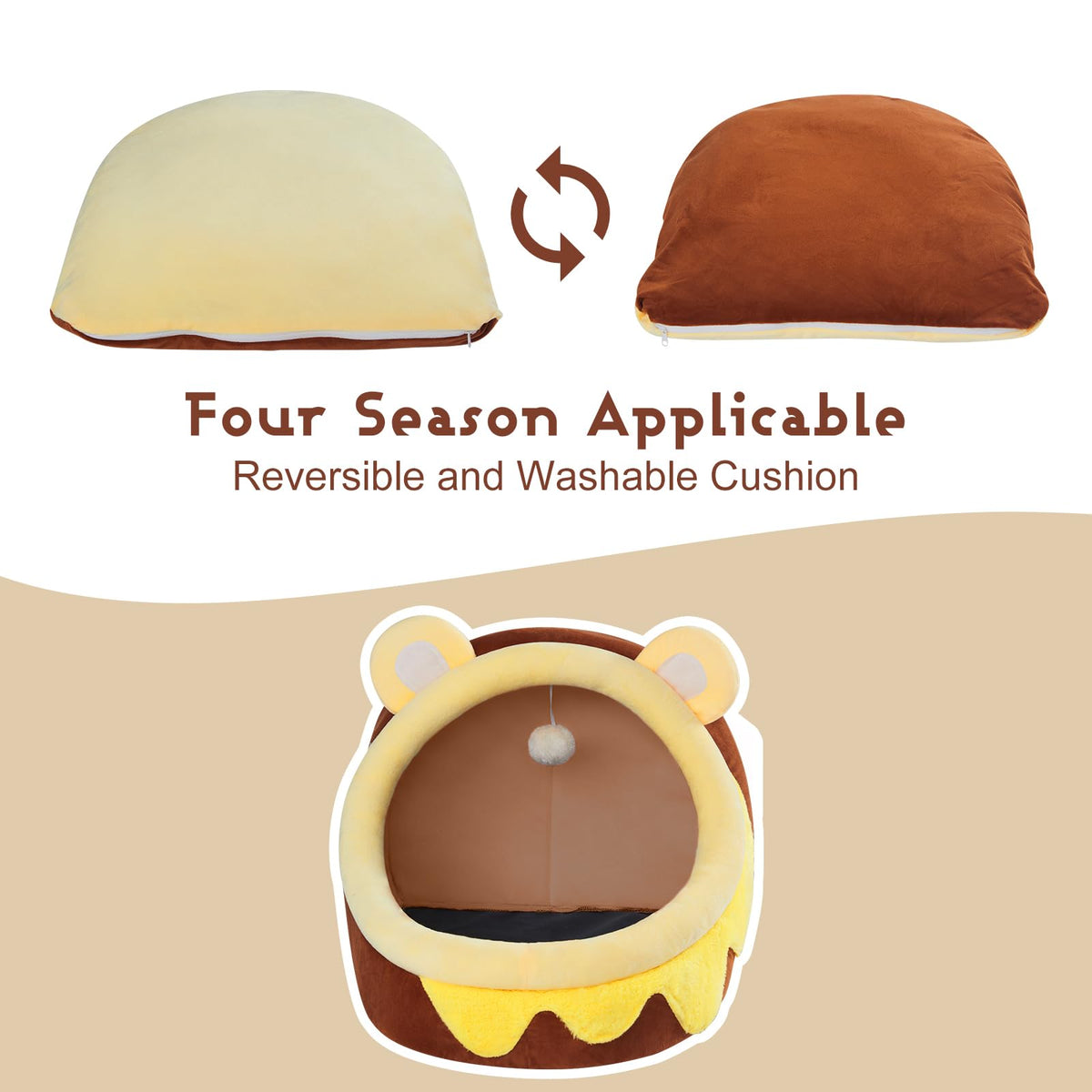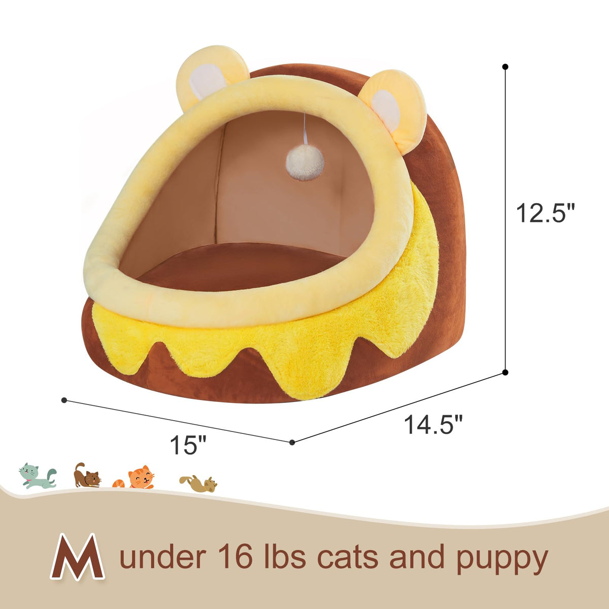 Product Name: Cute Cat Bed Comfortable Cat Igloo Puppy Tent Indoor Warm Non-Slip Cat Cave. Feature: 1?Cartoon Style Modeling Is Very Cute And Interesting. 2?Cute And Interesting Animal Shapes And Furry Balls Will Make Cats Appear Particularly Playful And Clever. 3?The Fabric Is Soft, Wrinkle-Free And Has A Solid Feel. 4?Warm Design: The Inner Pillow Has Different Colors On Both Sides And Can Be Replaced. Specification: Material: Soft Crystal Velvet Sponge High Springback Pp Cotton Dimensions: M(15''X14.5''X12.5'') Color: Honeypot Package Includes: 1 X Cartoon Pet Nest