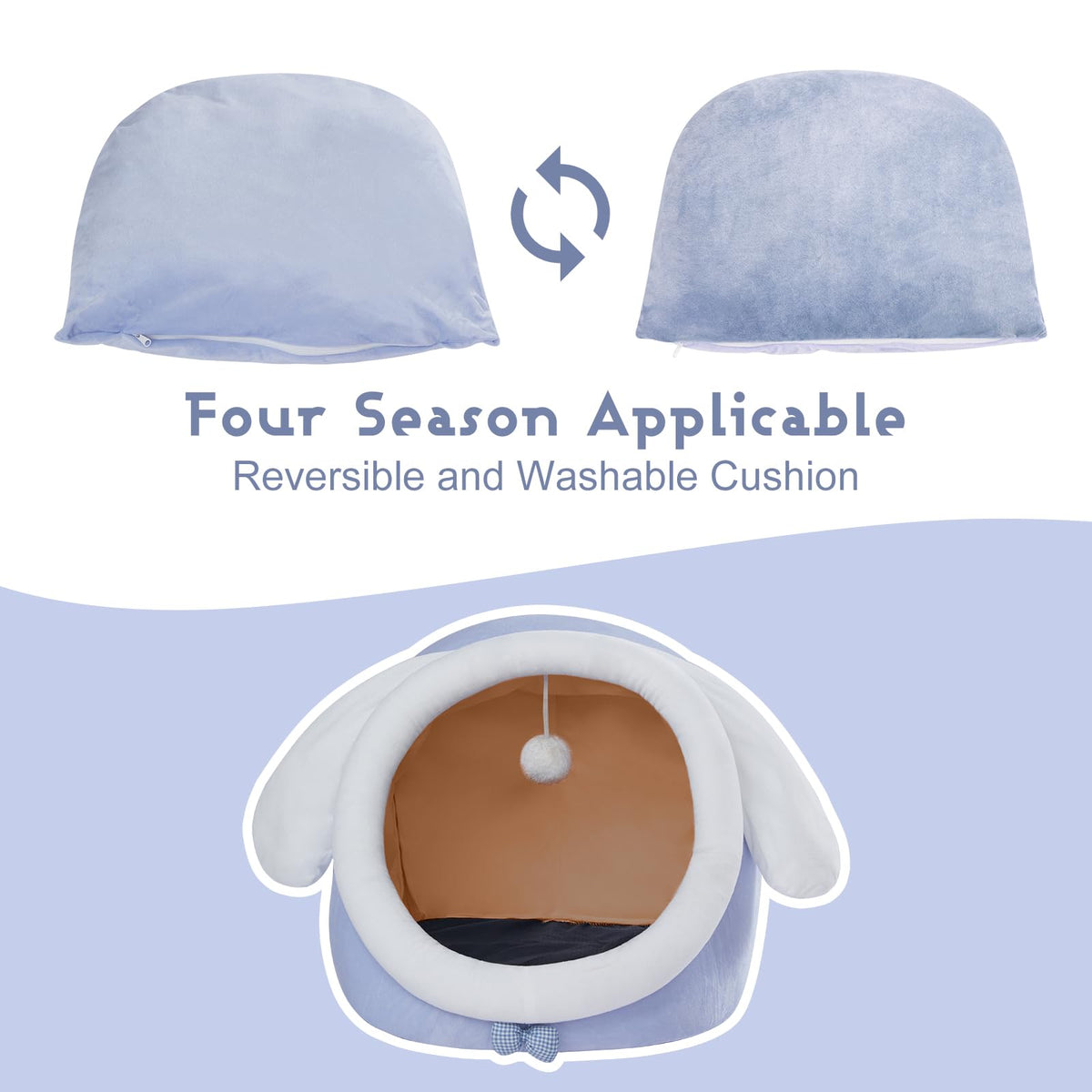 Product Name: Cute Cat Bed Comfortable Cat Igloo Puppy Tent Indoor Warm Non-Slip Cat Cave. Feature: 1?Cartoon Style Modeling Is Very Cute And Interesting. 2?Cute And Interesting Animal Shapes And Furry Balls Will Make Cats Appear Particularly Playful And Clever. 3?The Fabric Is Soft, Wrinkle-Free And Has A Solid Feel. 4?Warm Design: The Inner Pillow Has Different Colors On Both Sides And Can Be Replaced. Specification: Material: Soft Crystal Velvet Sponge High Springback Pp Cotton Dimensions: L(18''X17''X14.5'') Color: Big Ear Package Includes: 1 X Cartoon Pet Nest