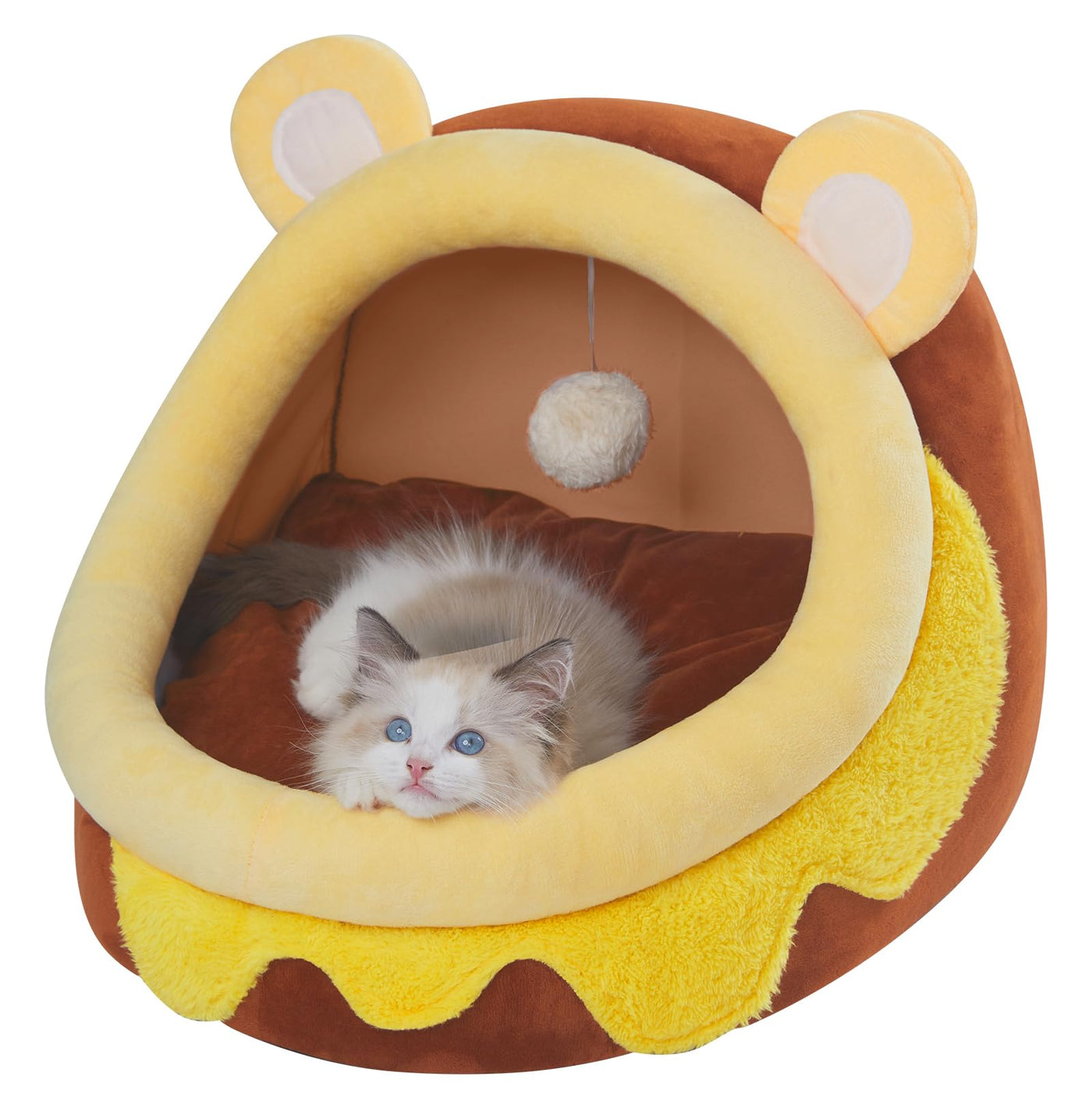 Product Name: Cute Cat Bed Comfortable Cat Igloo Puppy Tent Indoor Warm Non-Slip Cat Cave Feature: 1. Cartoon Style Modeling Is Very Cute And Interesting. 2. Cute And Interesting Animal Shapes And Furry Balls Will Make Cats Appear Particularly Playful And Clever. 3. The Fabric Is Soft, Wrinkle-Free And Has A Solid Feel. 4. Warm Design: The Inner Pillow Has Different Colors On Both Sides And Can Be Replaced. Specification: Material: Soft Crystal Velvet Sponge High Springback Pp Cotton Dimensions: S(13''X12''X11.8'') Color: Lovely Frog Package Includes: 1 X Cartoon Pet Nest