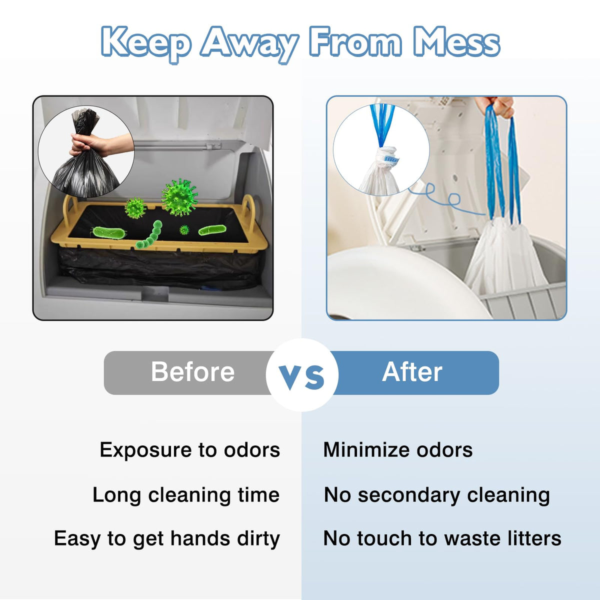 Our Thicken 1.2Mil Trash Bags Allows Them To Bear A Heavier Load Without The Risk Of Breaking Or Tearing, Ensuring A Mess-Free Experience. Comes With Durable Drawstring Handles For Effortless Disposal. Simply Pull The Drawstrings, Lift The Bag, Tie It Up And Throw It Away. Each Waste Bag Is Separated For Easily Taking Out. You Can Take A Single Bag From The Roll Without Tearing The Rest Bags. Our Kitty Litter Bags Is Compatible With Meo*Wan Self-Cleaning Cat Litter Boxes, For Litter Drawers Up To L+W