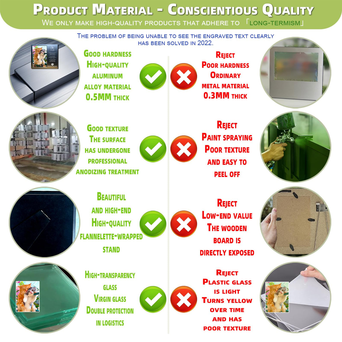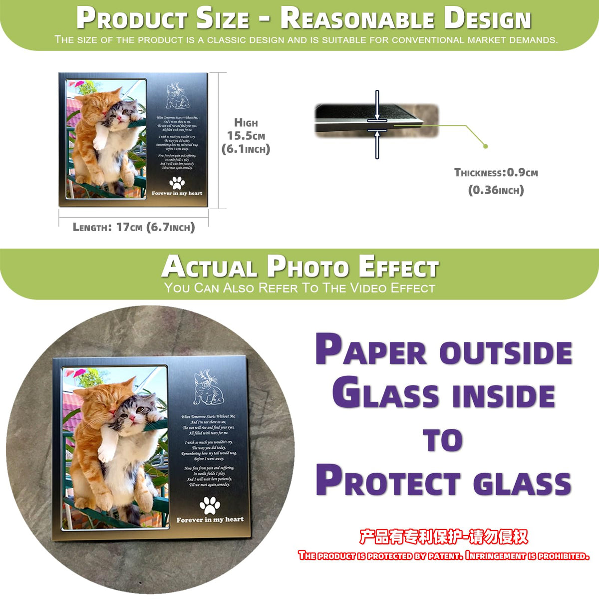 Q: What materials are used in the construction of this cat memorial frame?A: This memorial frame is made from high-quality aluminum alloy, ensuring durability and a lasting tribute to your beloved pet. It also features original glass and a stand made with high-end flannel.