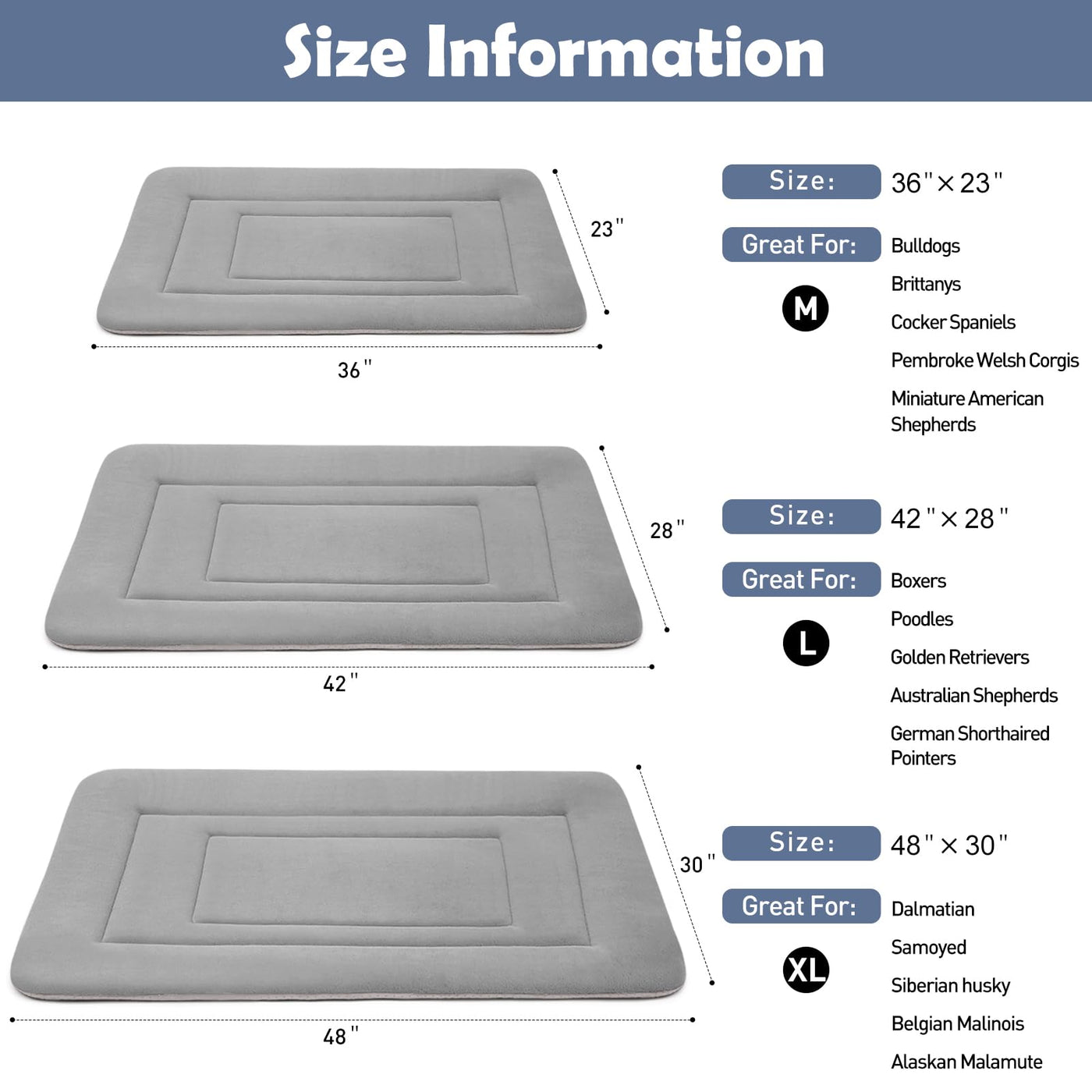 About Joicyco Pet Beds Material:Premium Fleece And Pp Fiber & Durable Material 100% Allow Both Hands And Machine Wash Non Slip Bottom Designed Crate Pad Mat 1,Cate Bed With Non-Slip Bottom Is To Make Sure Safe When Your Pet Steps On, Steps Off, Or Curls Up For A Nap. 2,Short Plush Fabric Sleep Surface Is Soft On Paws And Noses Which Is The Perfect Choice For Pets Who Like To Sprawl And Snooze The Day Away,Designed For Smaller, Large,Older Or Disabled Pets. 3,Long Last Material,The Fleece Cushion Holds To Years Of Use And Wash,The Ultra-Soft Fleece Won 'T Pill Up Like Other Fleece Pet Beds. Muli-Function Usage: The Dog Crate Bed Mat Good For Protecting Furniture,Floors Or Car Back Seat From Dander, Dirt And Fur The Non-Slip Bottom Will Keep Your Dog Safe When Nap On The Mat,Super Soft Surface Will Offer A Comfortable Feeling Colors Of The Bed Mat Are Good Complement Any Home Decor. Size:36/42/48 Inches For Choice Package: 1 X Dog Bed Mat 1 X Dog Bed Mat