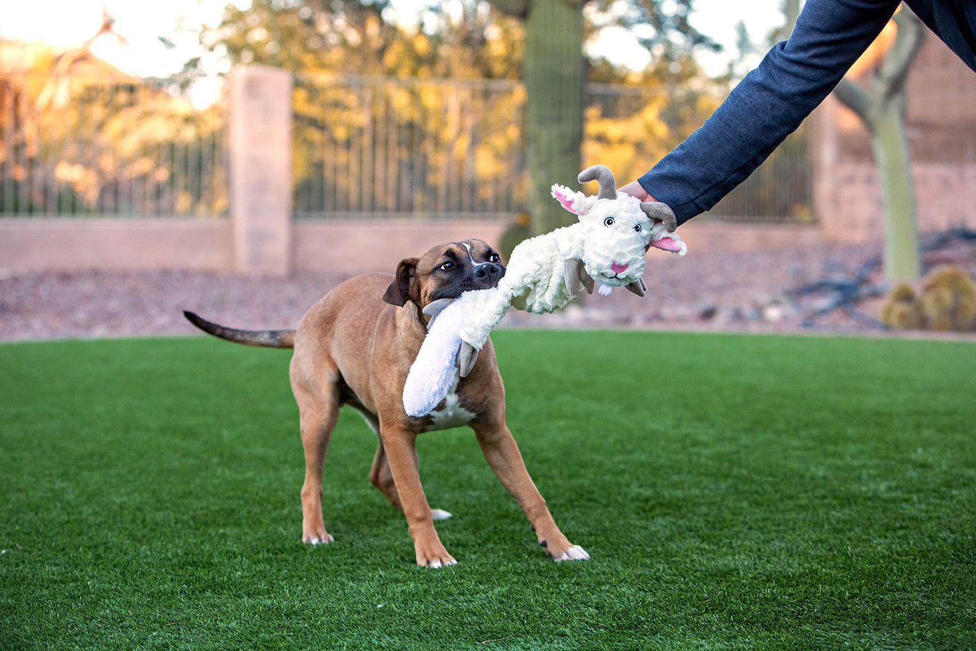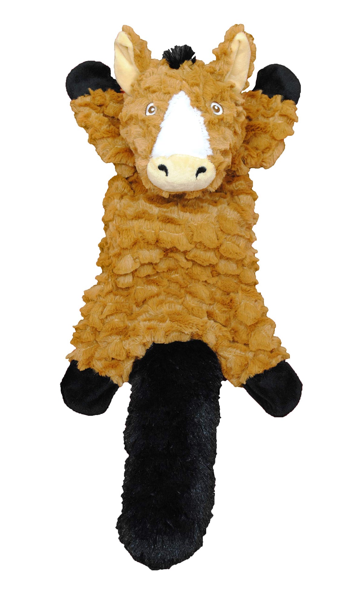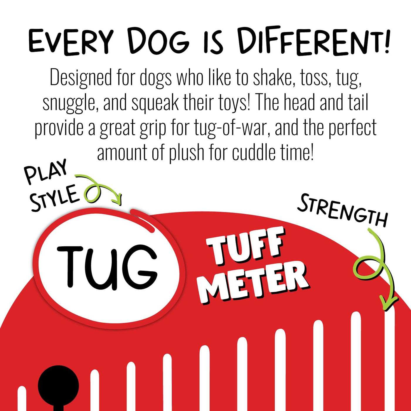 Designed for dogs who like to shake, toss, tug, snuggle, and squeak their toys. Stuffing in the head and tail provide a great grip for tug-of-war, and the perfect amount of plush for cuddle time. Constructed with a patented squeaking assembly, This toy SQ