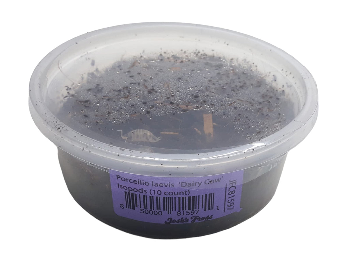 Porcellio Laevis 'Dairy Cow' Are A Hardy Species Of Isopod And Produce Quickly Once Established. Dairy Cow Isopods Are Large, Active, And Have A Neat White And Black Speckled Pattern. They Are A Larger, Fast Reproducing Isopod.