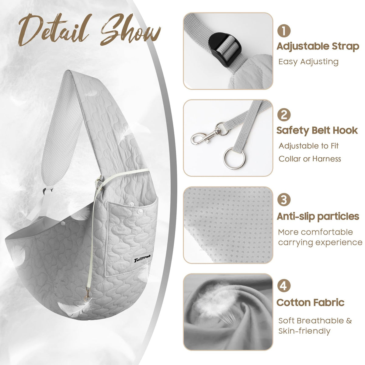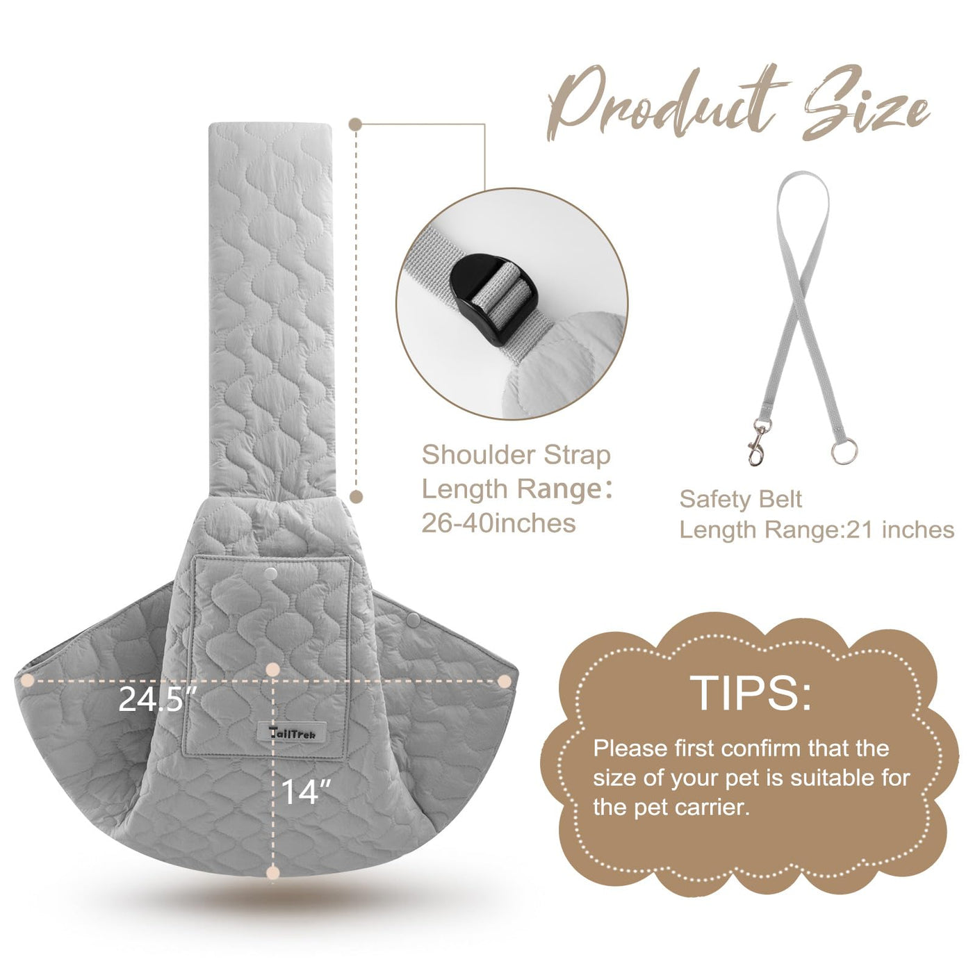 Dog And Cat Sling Carrier - Soft, Breathable, And Secure Soft And Breathable: Crafted From High-Quality Cotton, Ensuring Comfort For Your Pet. Convenient Pocket: A Side Pocket For Essentials Like Your Phone, Keys, And Snacks. Enhanced Safety: Double Safety Features, Including A Secure Hook And Buckles. Anti-Slip Interior: Silicone Particles Inside The Sling For Added Security And Stability. Adjustable And Easy To Clean: Fits Pets Up To 15 Lbs, Machine Washable, With An Adjustable Strap (26-40 Inches). Versatile And Practical: Perfect For Errands, Parties, And Walks-Keep Your Pet Close And Comfortable.