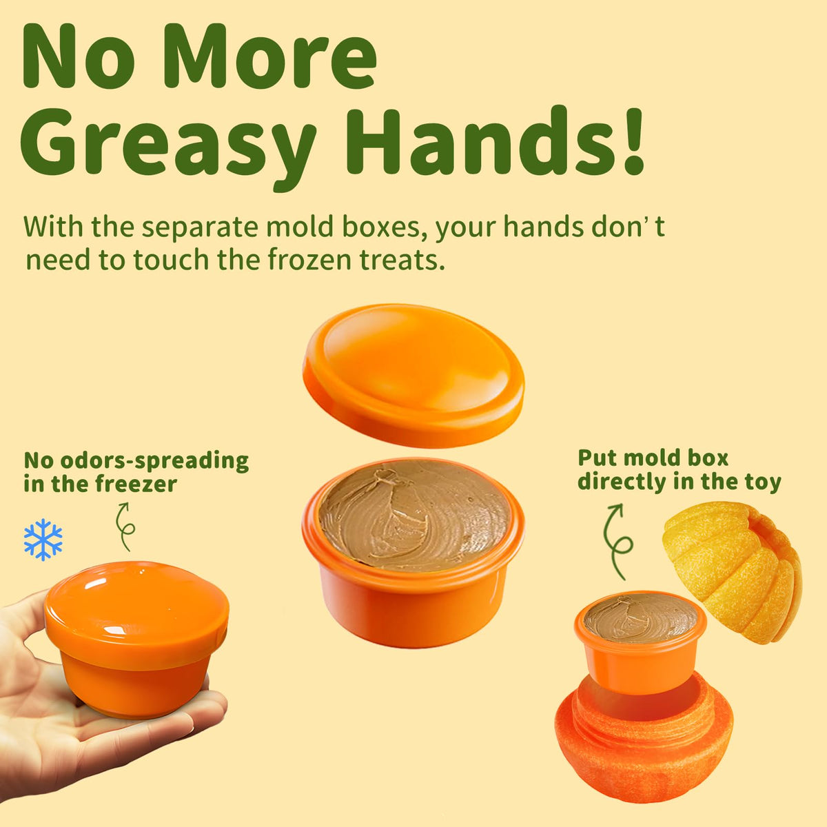 Fill the dog treat mold box with your dog's favorite snacks and place in the freezer, the lid ensures the freezer will not produce odors. The frozen treat and box can be put directly into the dog toy without removing the treat. Licking toy allows dogs to enjoy playing and eating longer. In addition, the innovatively designed replacement parts allow this toy to be used as a dog treat dispensing ball.