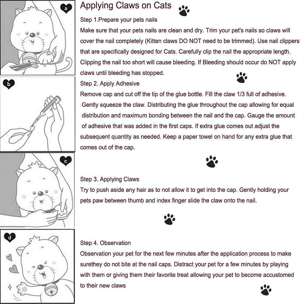 Q: How do I apply the nail caps to my cat's nails?A: To apply the nail caps, first trim your cat's nails, fill 1/3 of the cap with the provided adhesive glue, and then slide the cap over the nail. Wait for 5 minutes before allowing your cat to move freely.