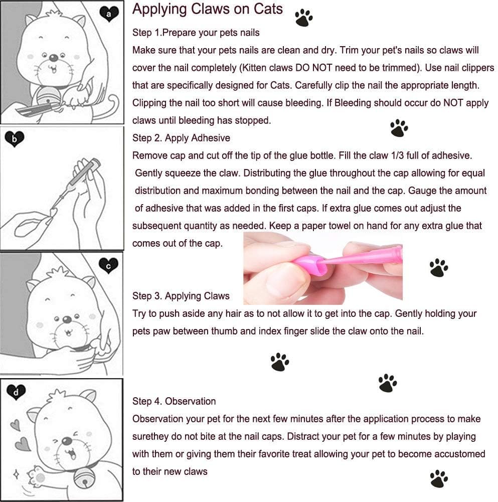 Apply on instruction (Better 2 people apply on) Step 1.Test the size is proper or not: Try one cap on first without the glue. If it doesn't fit, trim the open and of each nail cap until they fit your cat caps snugly. Step 2.Trimming cat nails and leave sufficient caps surface for the glue to adhere properly. (Kitten DO NOT need) Step 3.Cut the glue pipe neck, and use the applicator to help you accurately drop glue into the nail cap. Filling 1/3 nail cap with glue, not too much or too little.(Please be careful and avoid dropping glue on your hands or your cat’s fur, if you do, remove it with use nail varnish remover or dispergator immediately. ) Step 4.Sliding the cap over the nail Step 5.Waiting for 5 minutes before letting your cat go