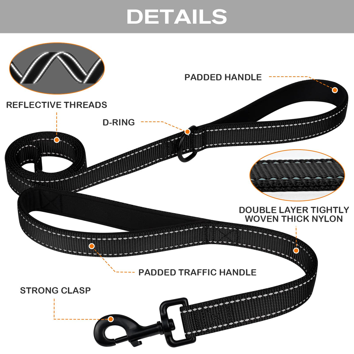 Q: Is the leash suitable for night walks?A: Yes, the leash features double-sided reflective stitching that enhances visibility during night walks, ensuring safety for both you and your dog.