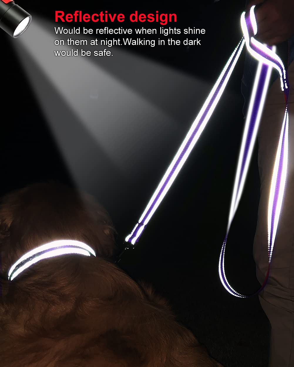 DOUBLE-SIDED REFLEcTIVE: Upgraded double-sided reflective leash features reflective stitching on both sides to improve its visibility and would be reflective when lights shine on it at night can keep your doggie safe during evening walks or runs cOMFORT gRIP: The handles have a soft cushion padding on the inside grip which makes it is comfortable to hold and provides much comfort to control your active furry baby protect your hand from rope burn Also come with a D ring on the handle to clip Joytale poop bags or accessories IDEAL LENgTH: 5ft length dog leash is a perfect balance between freedom and control It can give your dog as much freedom but still under your easy control The 34 width version fits small dogs and the 10 version suits medium or large dogs DURABLE 360AMETAL cLASP: With the heavy duty spinning snap to prevent the leash from twisting and tangling your dog can move freely around you for better control of your dog Nylon fabric with high density webbing to add durability PERFEcT cOMBINATION: We make nylon leashes in various colors to match our beautiful collars The matching reflective nylon collar is available by searching the asin B088B6H1LJ