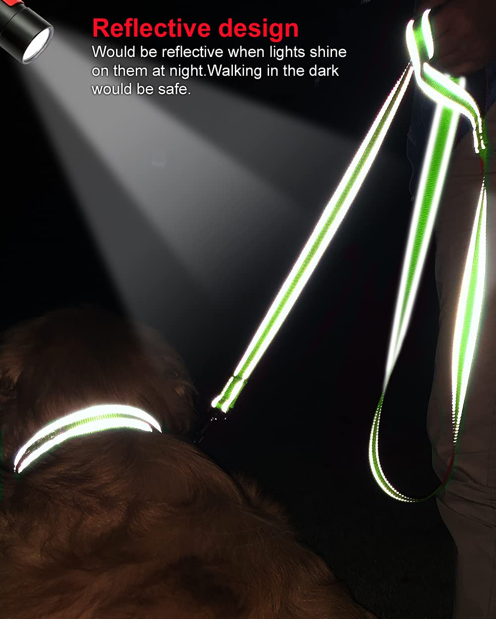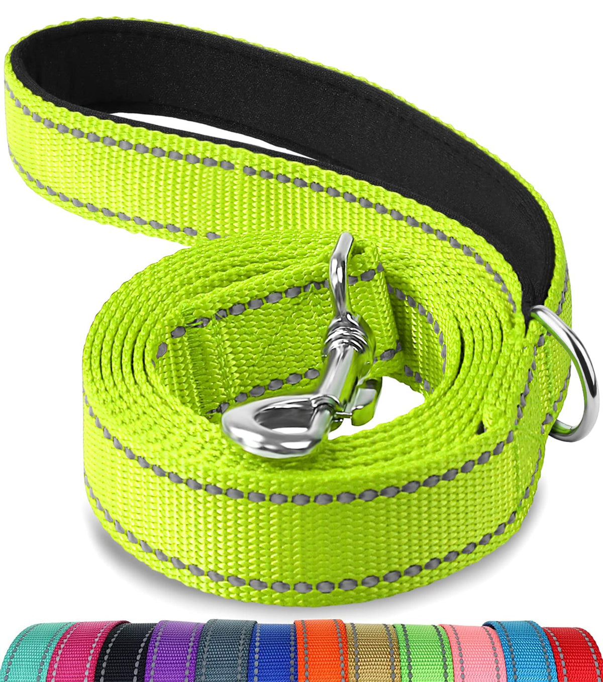 DOUBLE-SIDED REFLEcTIVE: Upgraded double-sided reflective leash features reflective stitching on both sides to improve its visibility and would be reflective when lights shine on it at night can keep your doggie safe during evening walks or runs cOMFORT gRIP: The handles have a soft cushion padding on the inside grip which makes it is comfortable to hold and provides much comfort to control your active furry baby protect your hand from rope burn Also come with a D ring on the handle to clip Joytale poop bags or accessories IDEAL LENgTH: 5ft length dog leash is a perfect balance between freedom and control It can give your dog as much freedom but still under your easy control The 34 width version fits small dogs and the 10 version suits medium or large dogs DURABLE 360AMETAL cLASP: With the heavy duty spinning snap to prevent the leash from twisting and tangling your dog can move freely around you for better control of your dog Nylon fabric with high density webbing to add durability PERFEcT cOMBINATION: We make nylon leashes in various colors to match our beautiful collars The matching reflective nylon collar is available by searching the asin B08cK6FY1N