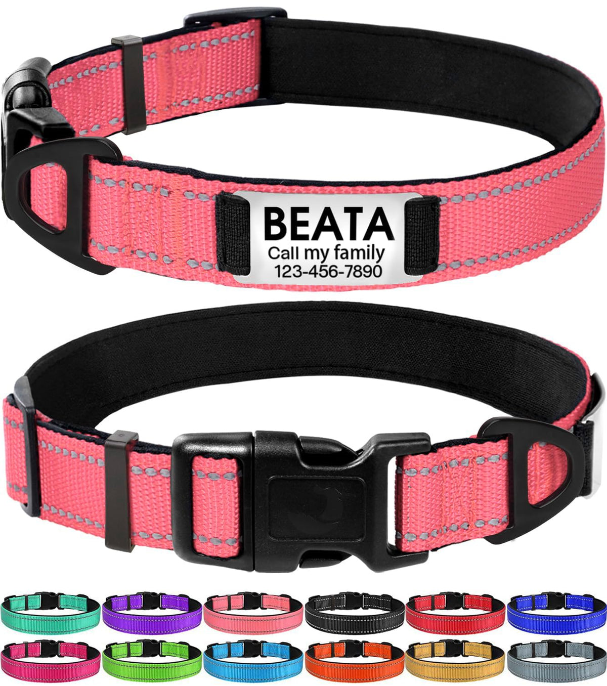 Collar Size Chart ----Find Correct Size XS - 5/8' x 10'-12', suitable for small puppy young dogs S - 3/4'x 12'-16', suitable for small dogs M - 1.0' x 14'-20', suitable for adult medium breeds and young large dogs L - 1.0' x 16-24',XL - 1 1/4'x(18-28') suitable for adult large breeds and macho dogs Features ----- Ideal Personalized Dog CollarsCollar Material - Premium reflective nylon Neoprene Padded - Comfortable soft inner padded, protect dogs' sensitive fur On Collar ID Tags - Stainless steel nameplate for a long term use Clear Text - Up to 4 lines customized text, all characters are etched by laser, personalized text are readable. For size S, 3 lines will be better. Durable Buckle - The plastic quick release buckle is created by BPA Free ABS, super durable and agile.Rust Resistant D Ring - Stainless steel lead attaching D ring is made of stainless steel, sturdy and strong Various Color for Boys & girls - Black, Navy Blue, Light Blue, Orange, Purple, Pink, Red. Package Including: 1 Collar & 1 slide on ID Tag