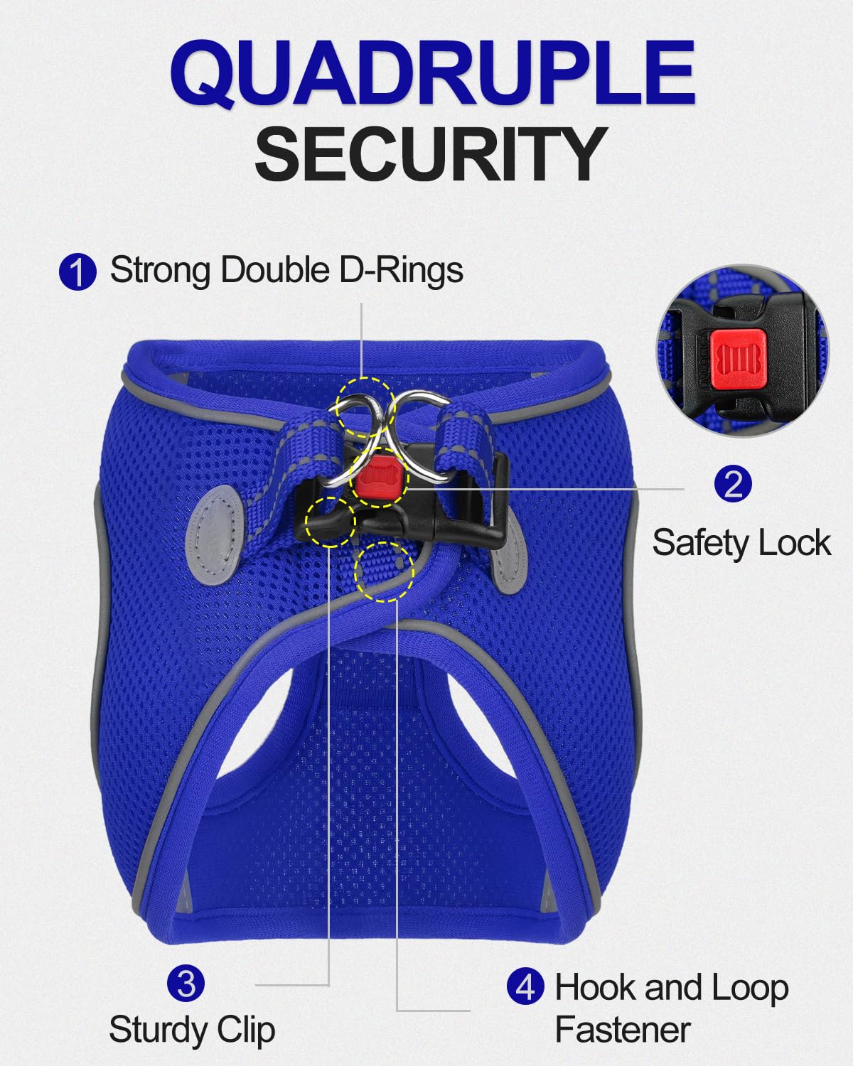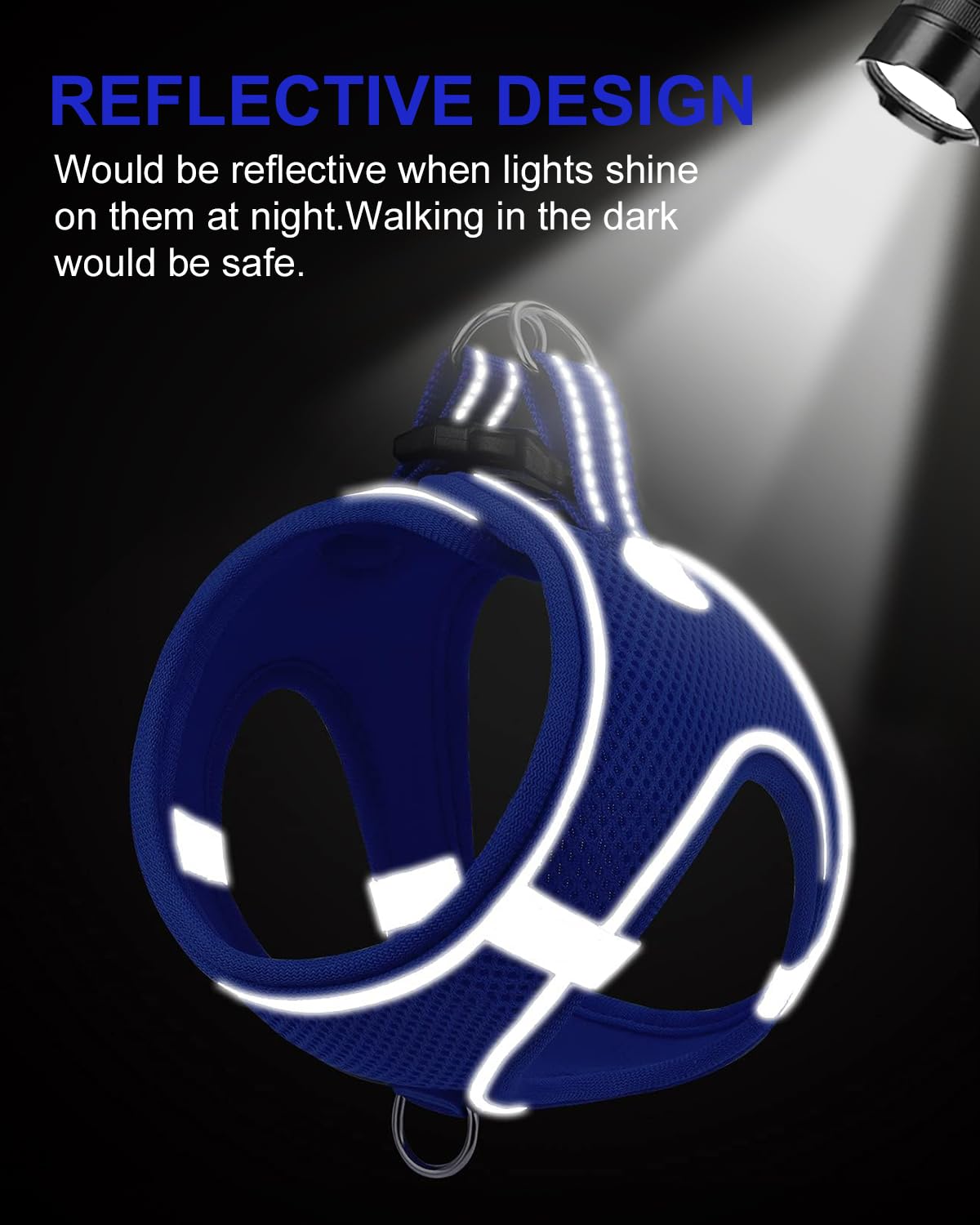 Q: How does the reflective design enhance my dog's safety?A: The harness features 360° highly reflective strips and bands that improve visibility during nighttime walks, ensuring your dog is seen by others. This added safety feature is ideal for evening outings.