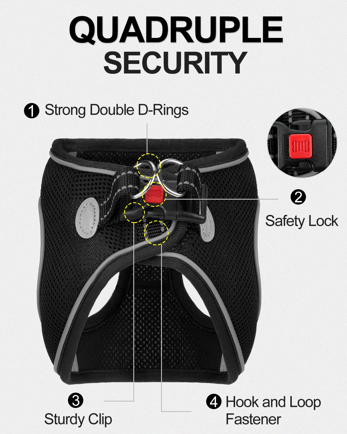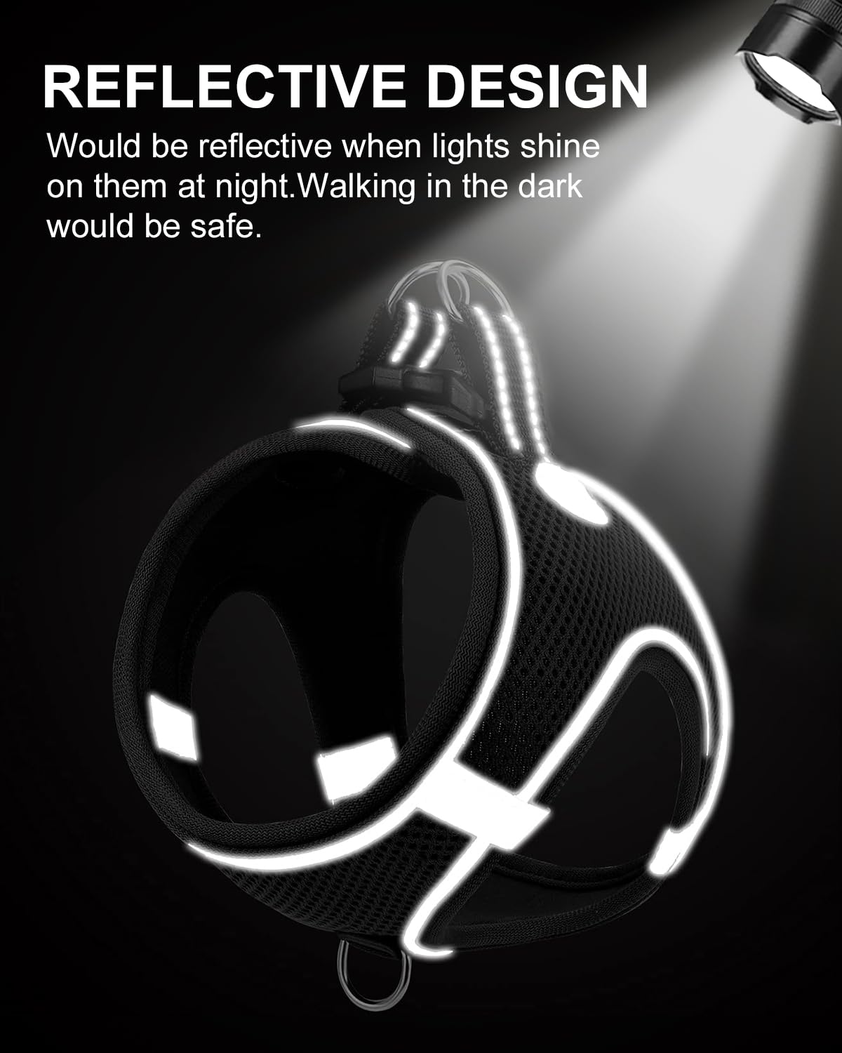 Size guide] It is highly recommended to measure the widest part of your pets chest and neck and refer the size chart before placing an order It is not suggested to choose the size by weight only It is ideal for extra-small small and medium male female breeds Reflective Design] With 360A highly reflective strips and 4 reflective wide bands a good visibility is provided in the dark Thanks to no-choke design the dogAs trachea and throat are protected from pulling and choking For extra security there is a quickrelease buckle D-Ring Function] We have added little and useful designs to help your walk be more enjoyable with your dogs At the front there is D-ring that can be attached to your petAs ID tag and clip-on LED light Moreover to hold your petAs poop bags there is a loop on the back Breathable Air Mesh] Designed with soft comfortable lightweight easy to clean and quick drying mesh fabric this harness allows the dogsA body temperature to circulate outward in multiple directions through the vest It will not be suffocating for your active and playful pets Easy On and Off] This harness is a great choice for pets who do not enjoy over the head harnesses and it can be easily put on or taken off within seconds You just need to put their front feet into the hole close the hook loop the fastener and snap the buckle and your dog is ready for the walk