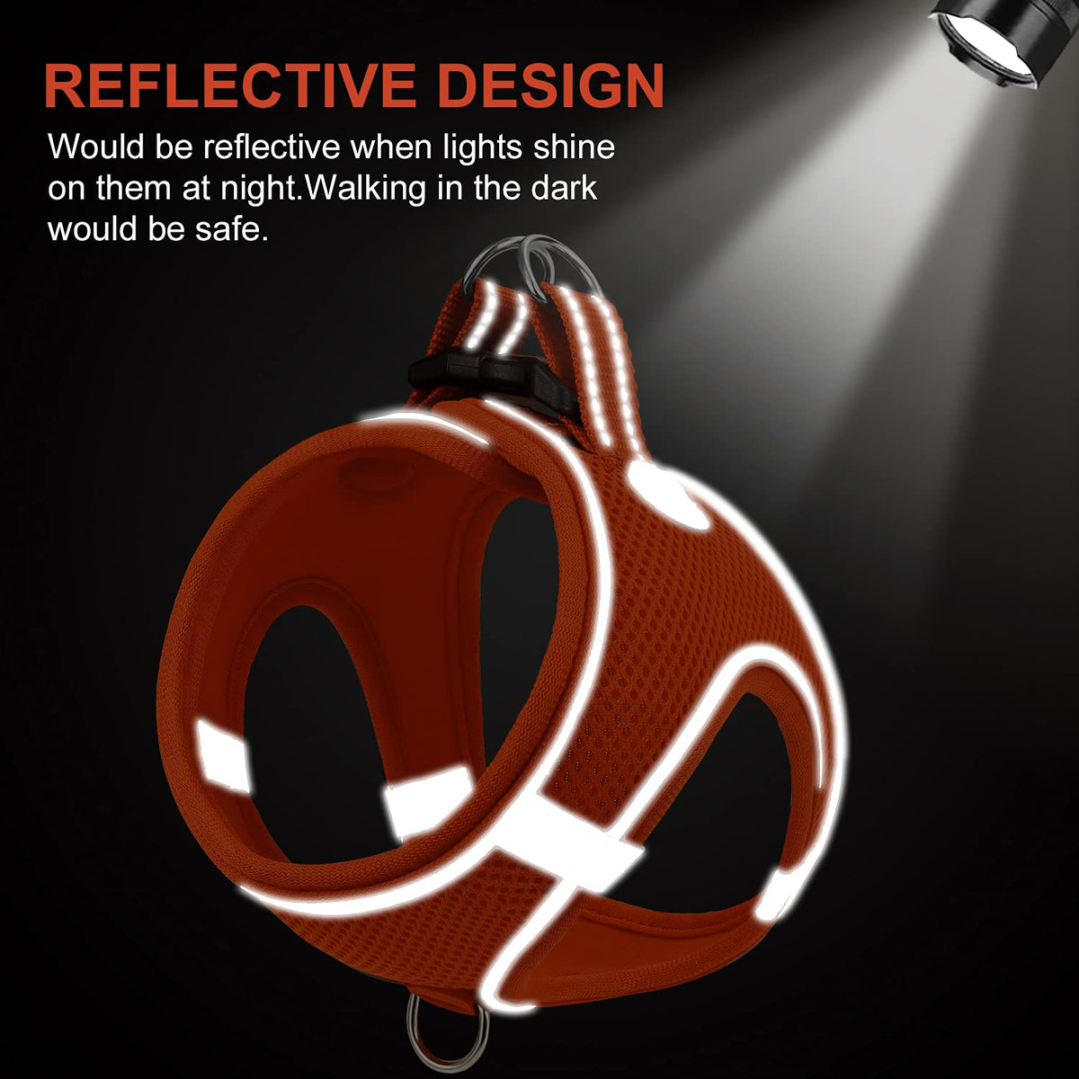 Q: How does the reflective design enhance safety during walks?A: The harness features a 360° reflective design with strips and bands that ensure high visibility during nighttime walks. This reflective aspect helps keep your dog safe by making them more visible to motorists and others in low-light conditions.