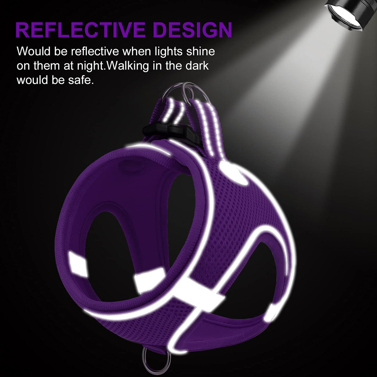 Q: How does the reflective design enhance safety during walks?A: The harness features 360° highly reflective strips and four reflective wide bands, providing excellent visibility in low-light conditions, which helps keep your dog safe during evening walks.