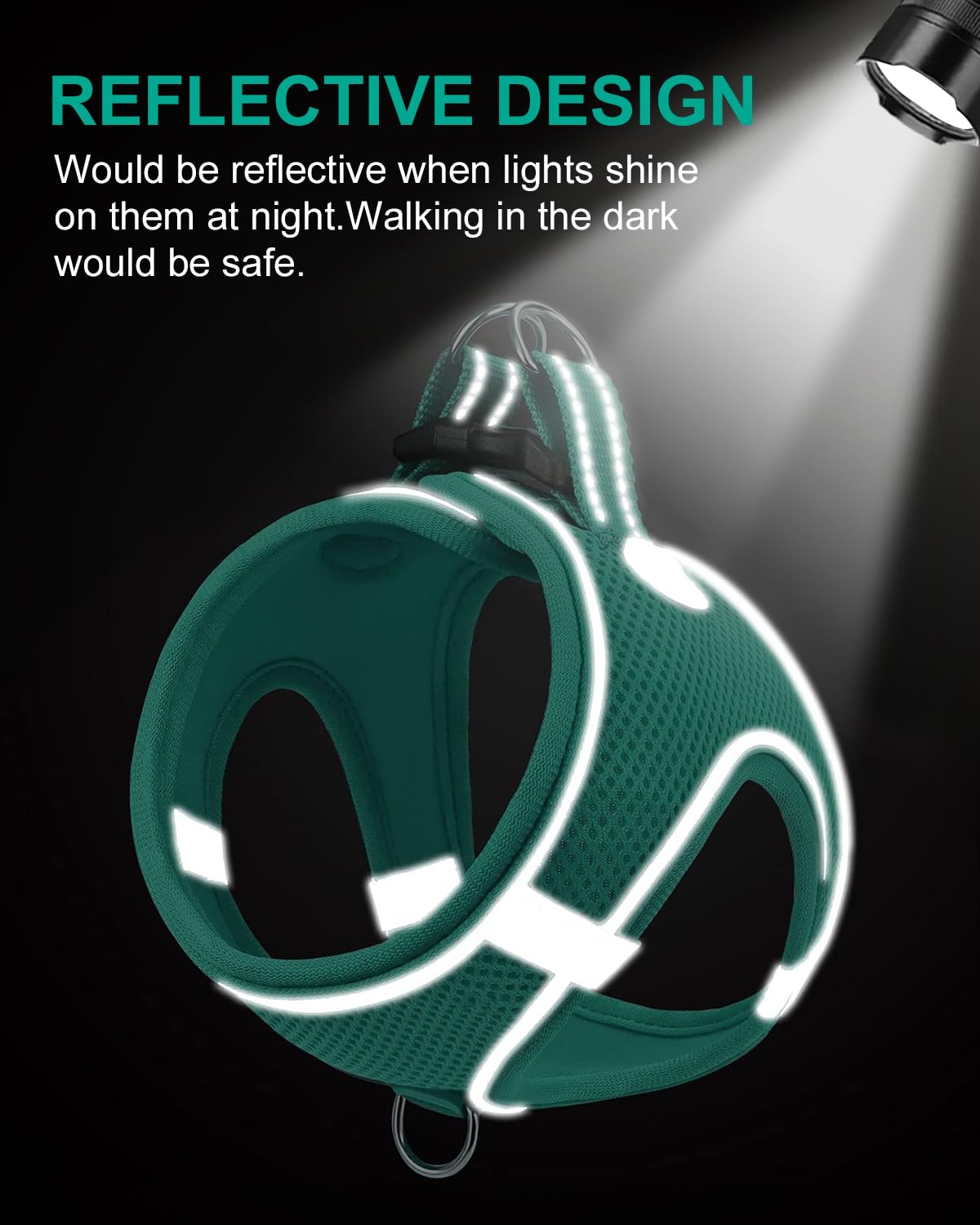 Size guide] It is highly recommended to measure the widest part of your pets chest and neck and refer the size chart before placing an order It is not suggested to choose the size by weight only It is ideal for extra-small small and medium male female breeds Reflective Design] With 360A highly reflective strips and 4 reflective wide bands a good visibility is provided in the dark Thanks to no-choke design the dogAs trachea and throat are protected from pulling and choking For extra security there is a quickrelease buckle D-Ring Function] We have added little and useful designs to help your walk be more enjoyable with your dogs At the front there is D-ring that can be attached to your petAs ID tag and clip-on LED light Moreover to hold your petAs poop bags there is a loop on the back Breathable Air Mesh] Designed with soft comfortable lightweight easy to clean and quick drying mesh fabric this harness allows the dogsA body temperature to circulate outward in multiple directions through the vest It will not be suffocating for your active and playful pets Easy On and Off] This harness is a great choice for pets who do not enjoy over the head harnesses and it can be easily put on or taken off within seconds You just need to put their front feet into the hole close the hook loop the fastener and snap the buckle and your dog is ready for the walk