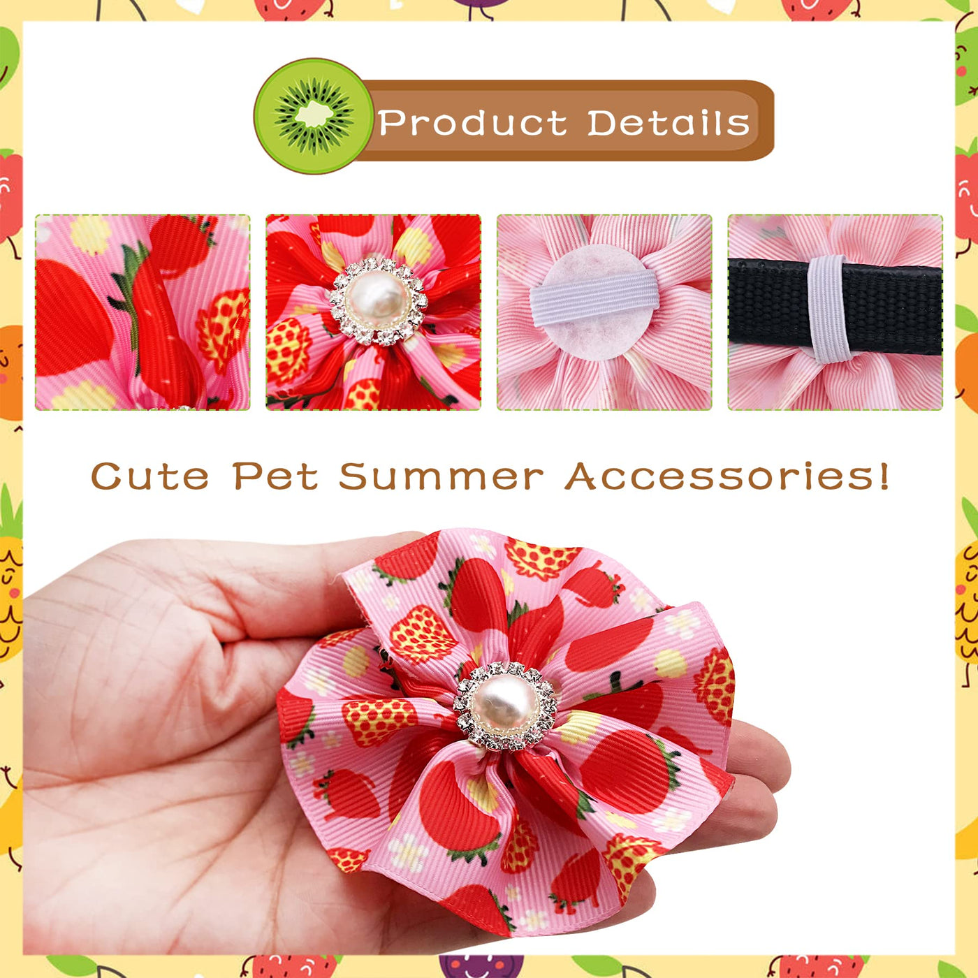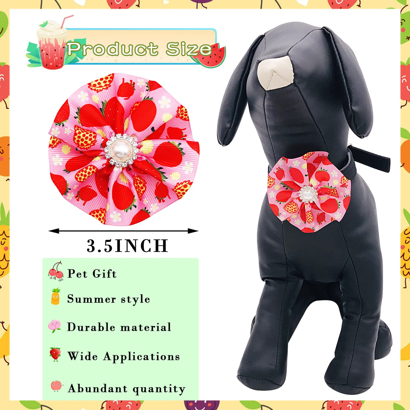 Flower For Dog Collar Female: 12Pcs A Pack&Nbsp;As The Pictures &Nbsp;Strawberry,Cherry, Avocado,Peach, Pineapple,Watermelon,Grape Pattern For Your Dog Collar. It Is Very Suitable For Your Girl Dogs. Dog Collar Flowers: The Flowers Diameter About 3.5 Inch/9&Nbsp;Cm, Fit For 15-30Mm Pet Collars. This Design Is Not Only Suitable For Small Medium Pet Animal As Puppy Yorkie Cat Rabbit But Can Also Suitable For Large Husky Shepherd Labradoodle . Dog Collar Flower Charm: Made Of Chiffon, Backside Double Rubber Bands, One Left One Right, Soft And Silky, Solid And Durable, Decorate Your Dogs Collar And Dress Up Your Lovely Dogs, Wont Be A Burden To Your Dogs Daily Life . Flower Dog Collar Attachment Design: Very Cute Collar Flowers Embellishment.Summber Fruit Flower Is Very Easy To Put On The Collar And It Wont Move Around. Also It Is Very Light And Durable. You Can Take It Off Easily. &Nbsp; Wide Use: Good Choice For Photo Shoot ,Take A Cute Picture For Your Pet, Best For Birthday, Holiday, Wedding Party,Valentine'S Day And Daily Walking The Dog .Likewise, Pet Shops Can Be Used As Small Gifts For Customers.