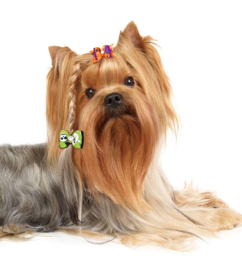 Q: How many hair bows come in a package, and what colors can I expect?A: Each package contains 50 hair bows in various random styles and colors, which may include black, orange, blue, green, and white. The assortment is designed to provide a variety of options for your pet's Halloween attire.