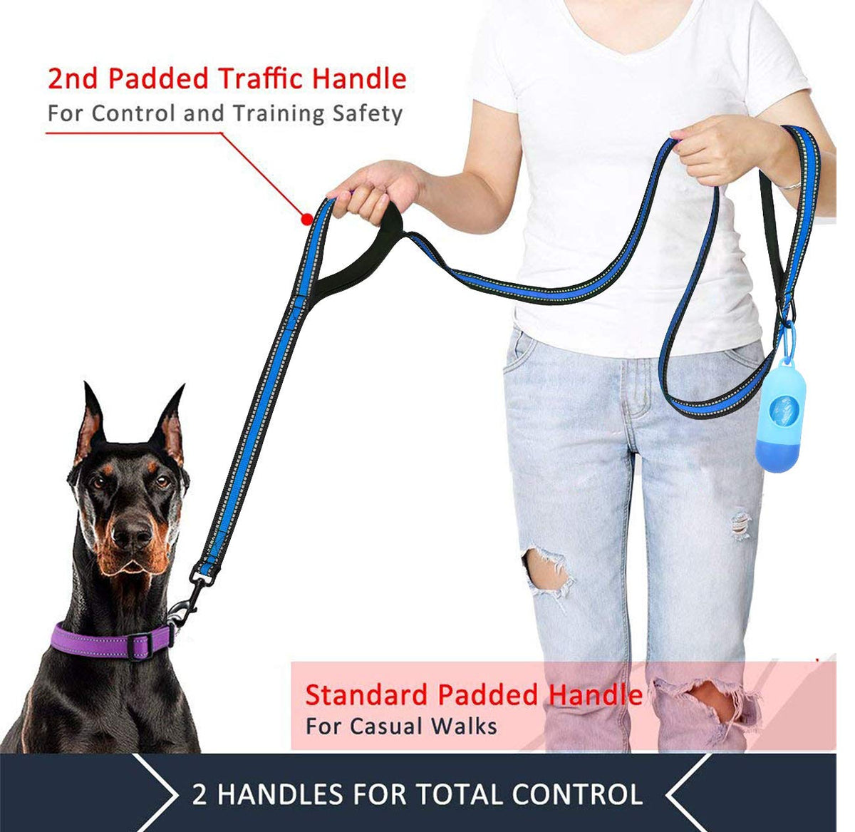 Product Feature: 1/2-Inch Diameter Rock Climbing Rope Double Comfortable Foam Handle 360 Tangle Rustproof Hook Highly Reflective Threads Ring For Poop Bag Holder Or Bowl Poop Bag Holder With 1 Roll Bag Inside(15 Bags) Product Description: The Dog Leashes Are Made Of Strong 1/2-Inch Diameter Rock Climbing Rope. 360 Tangle Free And Rustproof Swivel Hook That Are Stronger Than Others. Double Handle Design With Soft Padded That Help You Maintain Firm And Comfortable Grip. 5 Ft Length Dog Leash Is A Perfect Balance Between Freedom And Control. Using The Second Handle At The 2 Ft Of The Rope,Shorten The Distance Of Your Dogs. Highly Reflective Threads Dog Leashes Keeps You Both Safe And Visible On Your Late-Evening Walks. The Dog Leash Come With Dog Poop Bag Dispenser,Includes 1 Roll (15 Dog Poop Bags) Great For Small,Medium,Large Dogs Outdoor Walking, Running Or Training. Product Include: 1 X Double Handle Dog Leash 1 X Poop Bag Holder With 1 Roll Bag Inside(15 Bags)