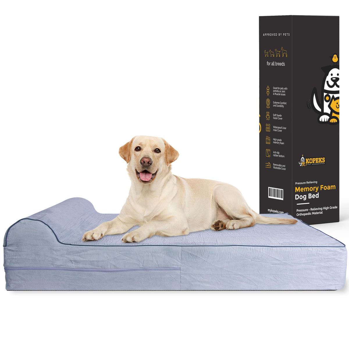 KOPEKS x large 7 Orthopedic Memory Foam Dog bed with 3 Pillow: KOPEKS introduces its superior quality 100% Orthopedic Memory Foam Dog bed with a 3 pillow and double layer protection: 1) waterproof removable liner covers the memory foam mattress and 2) a soft, plush Suede cover with an Anti-Slip Bottom to comfortably top it off. This memory foam bed is orthopedic grade for increased support and ultimate comfort. It will not flatten overtime. Similar to therapeutic foam found in high end mattress stores. The KOPEKS x large 7 Orthopedic Memory Foam Dog bed with 3 pillow can relieve your pets aches and pains. It is great for pets with arthritis, hip dysplasia, joint and muscle stiffness or simply to pamper your pooch that so much deserves the best sleep quality.