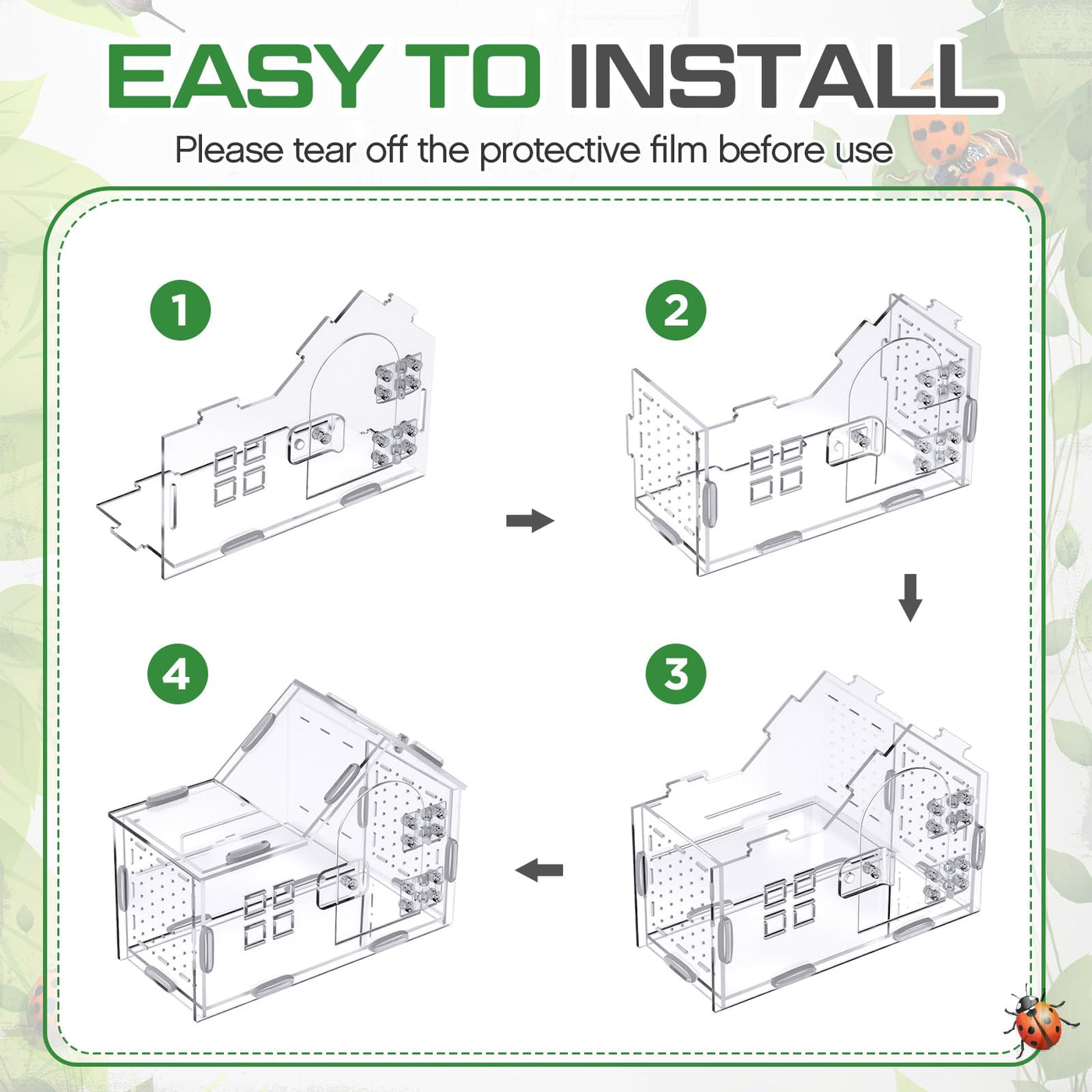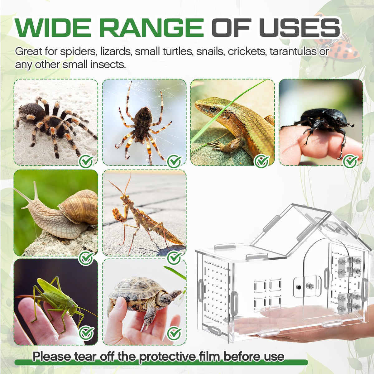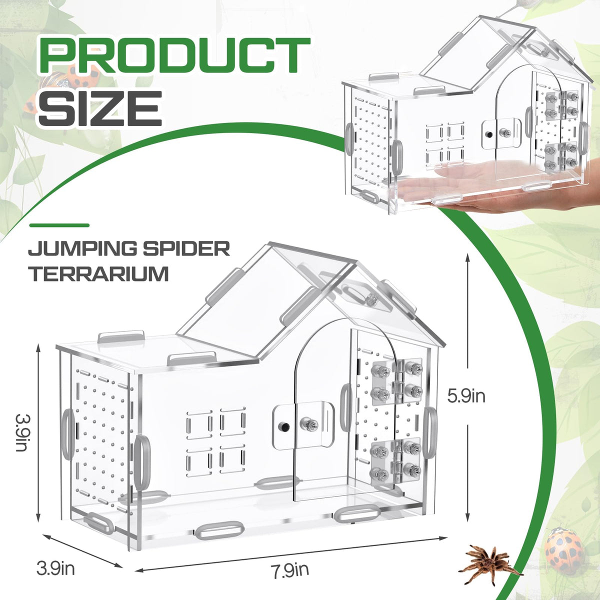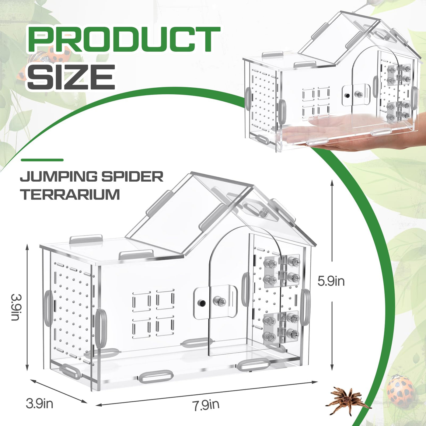 Features: Reliable lock mechanism keeps lid firmly sealed while permitting quick access for feeding or cleaning. Space saving modern house styling blends into home decor while providing a sheltered environment. Combines functionality with subtle aesthetic appeal. Specifications: Material: acrylic Color: clear Size: about 7.9 x 5.9 x 3.9 Inches Package includes: 1 x Jumping spider enclosure Notes: Manual measurement, please allow slight errors on size. The color may exist a slight difference due to different screen displays.