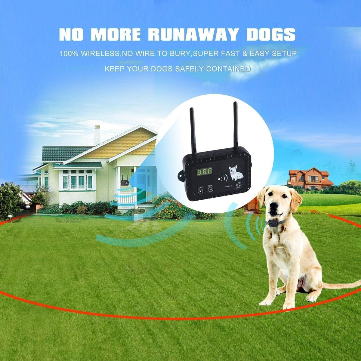 100% Wireless Electric Dog Fence System The intelligent wireless fence system is the unique and new type product in the market, with the lovely design shape and simple operation. Its capable of the reliably protecting your pet and excellent contain your pet within the set boundary.If the dog exceed the set activity range,vibration and static shock dog training function will automatically start to warn the dog back to the safe area. Product Features: Latest No wire , you don 't need to dig to bury wire or stack in your yard. Rechargeable and waterproof receiver collar, longer life than other similar receivers.Receiver collar with high capacity built-in battery, can continuously work for 24 hours. 100-990 Levels for signal intensity can be adjusted on the transmitter will prevent your pet from straying from the boundary. Important Note: This product is not applicable to indoor use since there 's too many interference factors in indoor. The signal light will flash when the receiver is low battery. Please read the manual carefully before use This product relies on wireless signal, many factors may affect the control range, such as air humidity, walls, wireless signal and so on. Package content: 1 x Wireless Fence Transmitter 1 x Collar Receiver 14 x Training Flags 1 x Test Light Tool 2 x Power Adapter 2 x Transmitter Wall Mount Screws8 x Collar Contacts 1 x English Manual