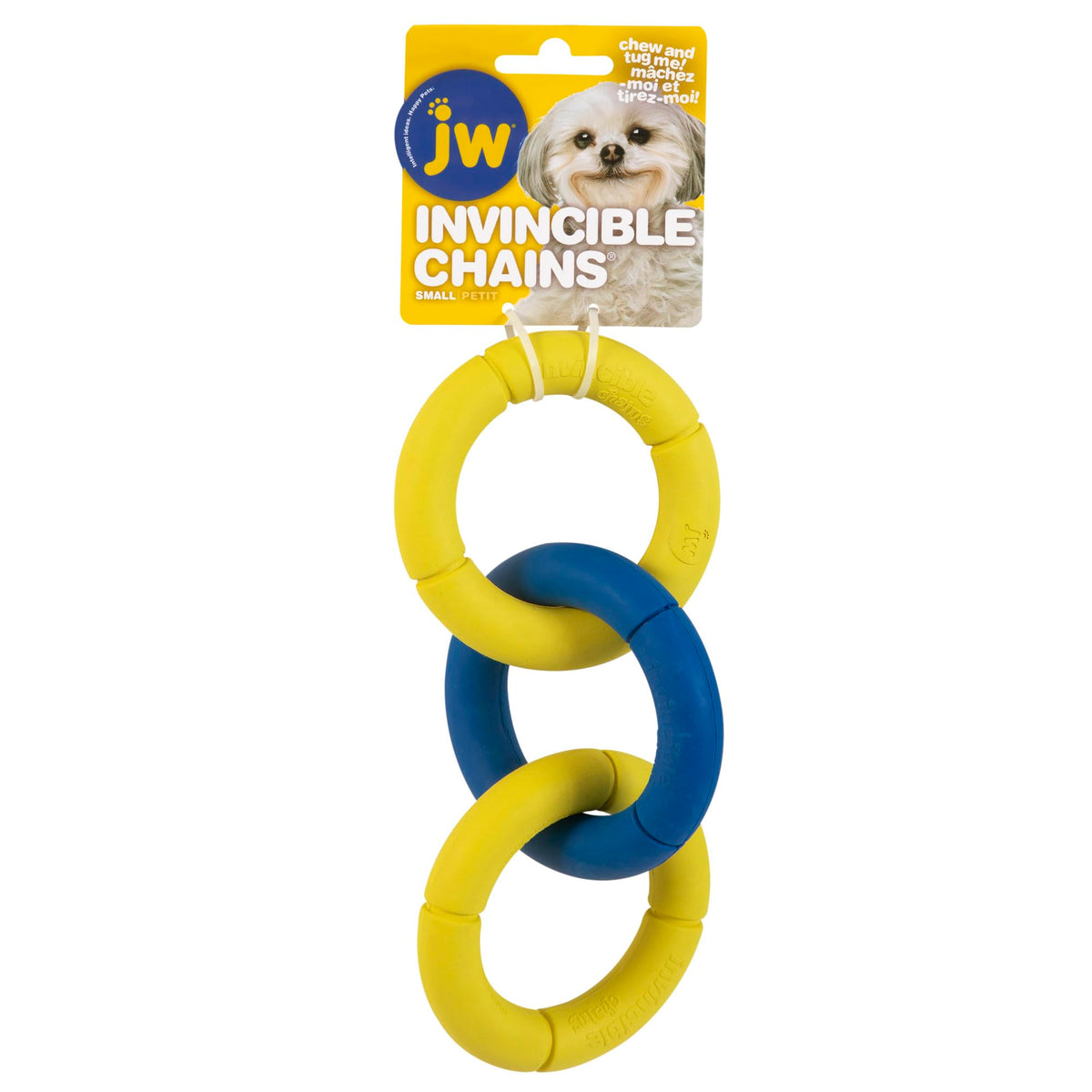 JW Invincible Chains provides your dog with the rubber texture he loves to chew on. Solid, no glue construction stands up to the abuse. A terrific tug as well - easy to hold on to while your dog tugs will all his or her might. Enjoy a game of toss and tug with this unique dog toy. Features include rubber rings with rope. Durable, great for interactive play, this JW dog toy is ideal for tug and fetch. WARNING! For supervised play only. Know your dog and choose the appropriate size and type of toy to prevent choking or other harm. Inspect this toy regularly; if toy is damaged or if parts become separated, remove toy and parts as injury may result. Not a childs toy. Tug, toss, fetch and chew the Invincible Chain will provide hours of fun for your dog. Excellent for small and medium breed dogs.