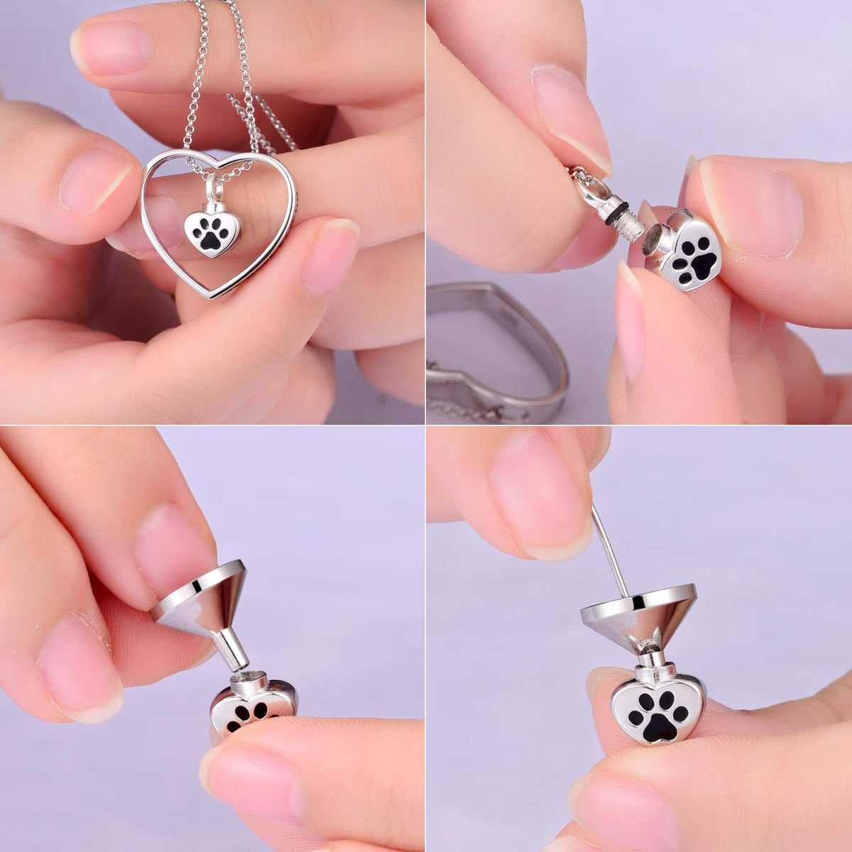Q: How do I fill the urn pendant with ashes or fur?A: The necklace comes with a funnel filler kit, making it easy to fill the urn pendant with a small amount of your pet's ashes or fur securely.