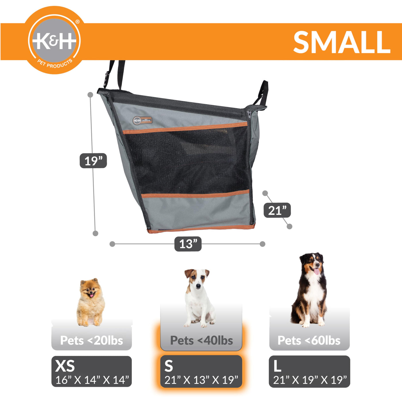 Q: What size dogs can use the K&H Pet Products Buckle N' Go Dog Car Seat?A: The K&H Buckle N' Go Dog Car Seat is designed for small to medium dogs. It measures 21”L x 13”W x 19”H and does not have a specific weight limit, making it suitable for a variety of small dog breeds.