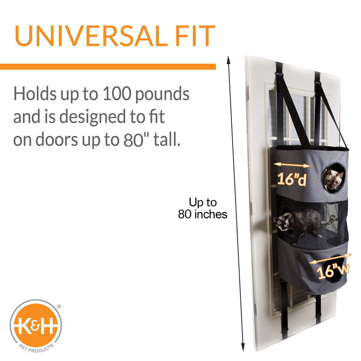 The K&H Pet Products Hangin Cat Condo Gray is available in two sizes, the modest 3-story Cat Condo and the 5-story High Rise Cat Condo. The High Rise is the ultimate for fun and relaxation. Designed with mesh windows on two levels of the five levels allows cats to look out. The incredible space-saving design simply attaches to any door. No more valuable floor space is taken up by bulky cat trees and cat furniture. The 3-story Condo is not only beautiful but is also functional. With top and bottom straps to securely lock the condo in place, it provides rigid security for your cats most ambitious playtime. A mesh window on the middle level allows cats to look out. This 3 story Hangin Cat Condo also was designed with a comfortable lounging or sleeping surface on the top. Designed by K&H with OVER 20 years of experience in creating safe, innovative, quality products for pets. One-year limited warranty.