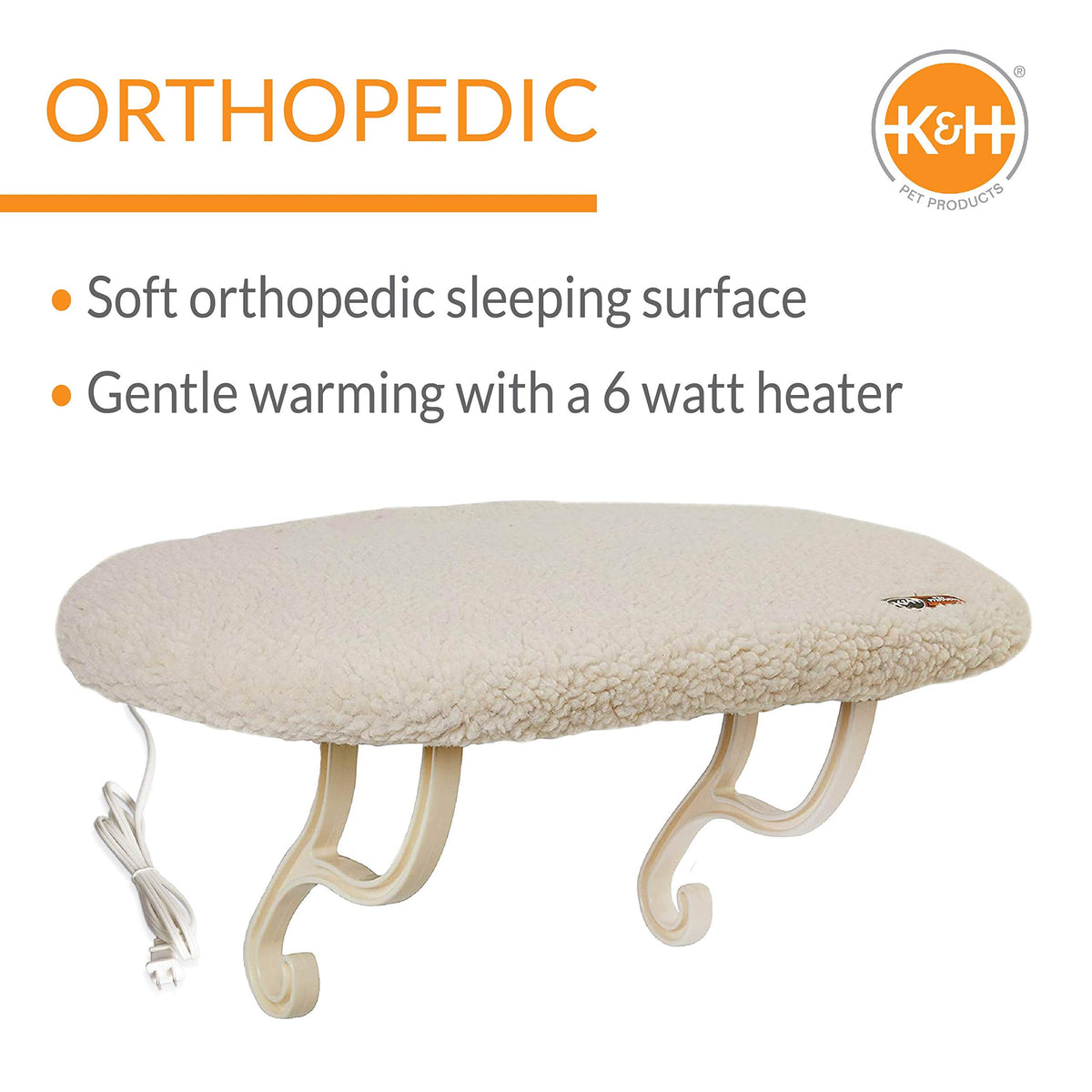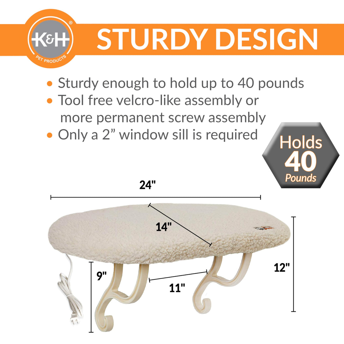 Engineered for extreme strength and easy assembly, the K&H Kitty Sill is purrfect for any cat that enjoys basking in the sun. In fact, this ingeniously designed cat perch can hold up to 40 pounds. The ultra-comfortable orthopedic foam and super soft fleece cover provide your cat with ultimate comfort while sunbathing in your window sill. The K&H Kitty Sill is available in both heated and unheated models. The heated Thermo-Kitty Sill includes a removable heater that provides the extra warmth your cat craves. Its internal thermostats warm to your cats body temperature when in use. No tools are needed for installation when using the hook & loop fasteners. Screws are also included for those who prefer a more permanent installation. The K&H heated cat window perch has been tested & certified by MET Labs and exceeds USA/CA electrical safety standards. K&H doesnt just use safety listed parts; we safety certify the entire product. Designed by K&H with OVER 20 years of experience in creating safe, innovative, quality products for pets; includes a one year warranty.