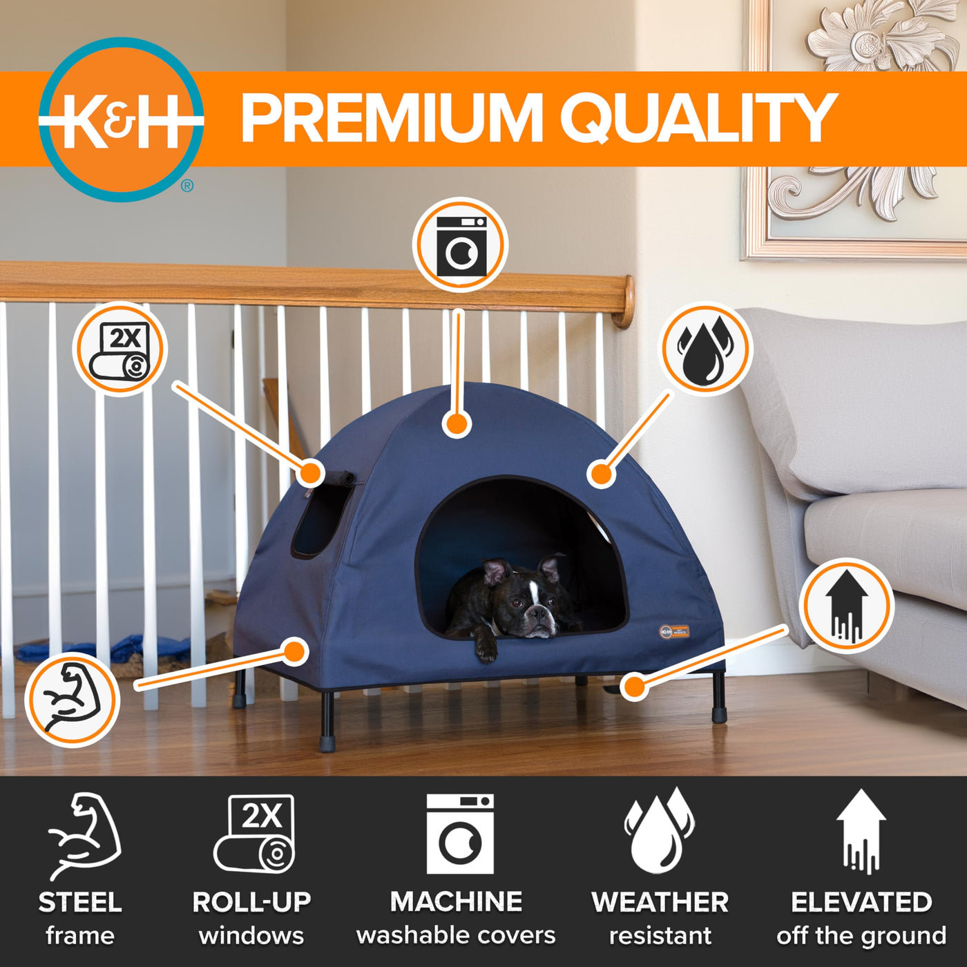 The K&H Pet Cot House uses the same comfortable raised frame and cover as the K&H Original Pet Cot with mesh center. No tools are necessary and easy to assemble. Elastic straps keep the cover securely in place. Each side of the house has a window that can be unzipped and rolled open for additional airflow. It provides privacy and shade for pets. It's like giving your pet an enclosed porch of their very own! Can be used with or without the house cover. Easy to pack and carry for travel. For indoor and outdoor use. One year limited warranty.