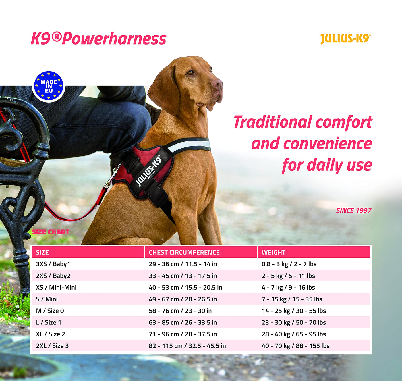 Product Descriptionk9 Powerharness The K9 Harnesses Are Made Of High Quality Materials: Impregnated Scratch-Resistant Outer Layer, Breathable Skin Friendly Inner Lining, Load Stability And Comfortable Weight Distribution, Sturdy Seams And Additional Components. Product Features: The K9 Powerharness Has A Handle On The Back For Easy Grip And Lifting Of The Dog. The Belly Strap Has A Heavy-Duty Plastic Buckle And The Chest Strap Has An Adjustable Hook And Loop Fastening. The Reflective Stripe On The Chest Strap Provides Magnificent Visibility. Each K9 Harness Comes With Phosphorescent, Interchangeable Hook And Loop Patches With Julius-K9 Logo - You Can Easily Order A Patch With Your Customised Text Or Choose From More Than 1000 Patches Readily Available. Patent Office Registration Numbers: 001924663-0017, 001924663-0018, 001924663-0019Set Contains:Harness. Product Booklet. User Manual (English Language Not Guaranteed). Product Label