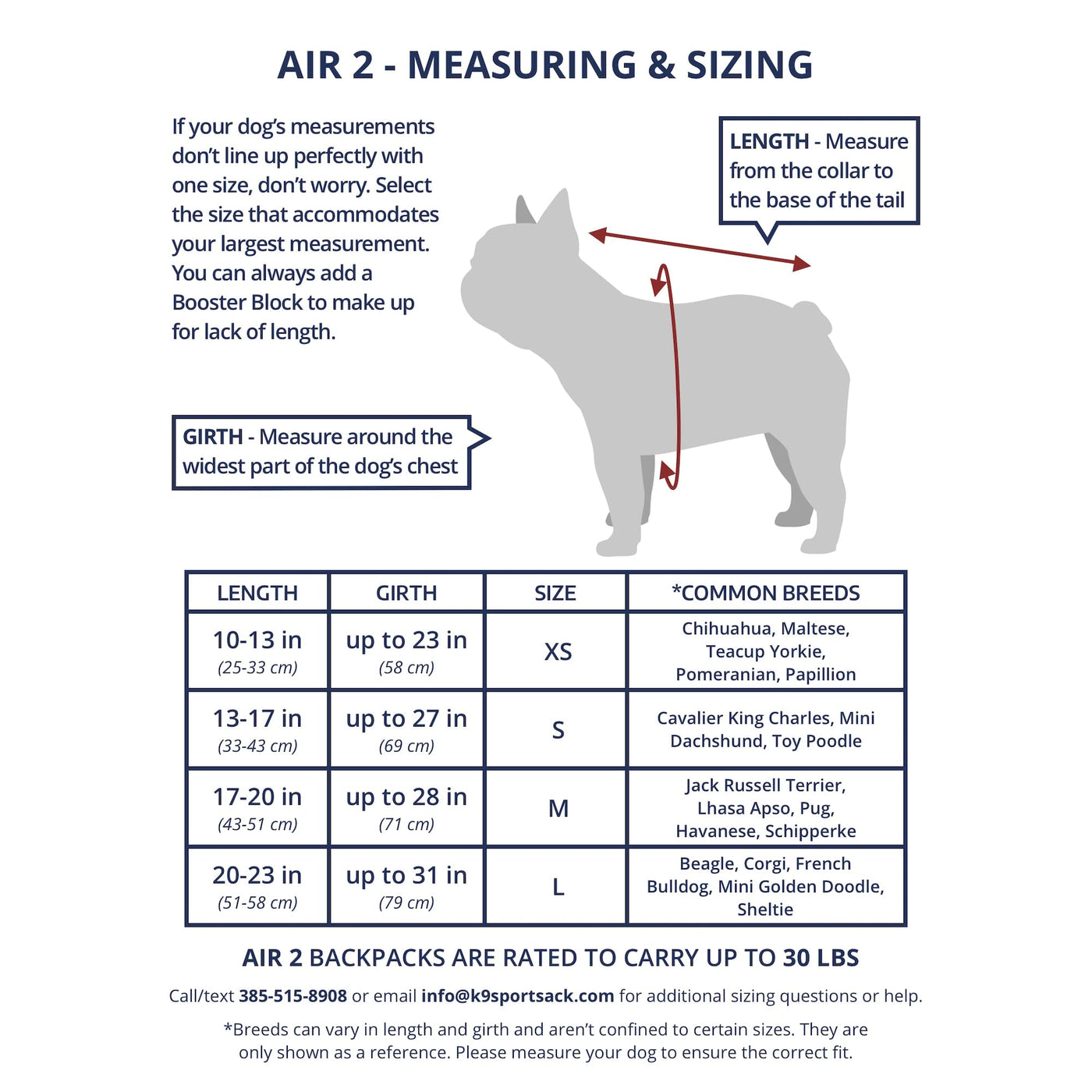The Air 2 is the backpack dog carrier people know best. Available in sizes XS-L, it is a durable, breathable mid-level backpack perfect for smaller to medium size dogs. The Air 2 is offered at a reasonable price while including the essential safety and comfort features needed for a comfortable experience. This backpack is recommended for intermediate grade walks, hikes, public transportation, and bike rides. The Air 2 is constructed with durable Cordura® fabric and form-fitting mesh on the sides for breathability. For Dogs Ranging 4-30 lbs (2-13 kgs) View More Sizing Instruction Features Ventilated side panels for cooling Adjustable dual side pockets Sternum strap with avalanche whistle clip Wide Base to accommodate your pet and its tail Updated Side Mesh New Side and Back Cinch Straps Updated Shoulder Strap Design (No More Popping Off Chest Clips) Fur Flap (No more zipping your dog's hair in the bag) Adjustable Collar Enclosure Compare K9 Sport Sack Carriers View Patent Info Safety All K9 Sport Sack carriers are specially developed under the close direction of animal professionals, veterinarians, dog trainers, and outdoor product engineers to be ergonomic, safe, and strong.
