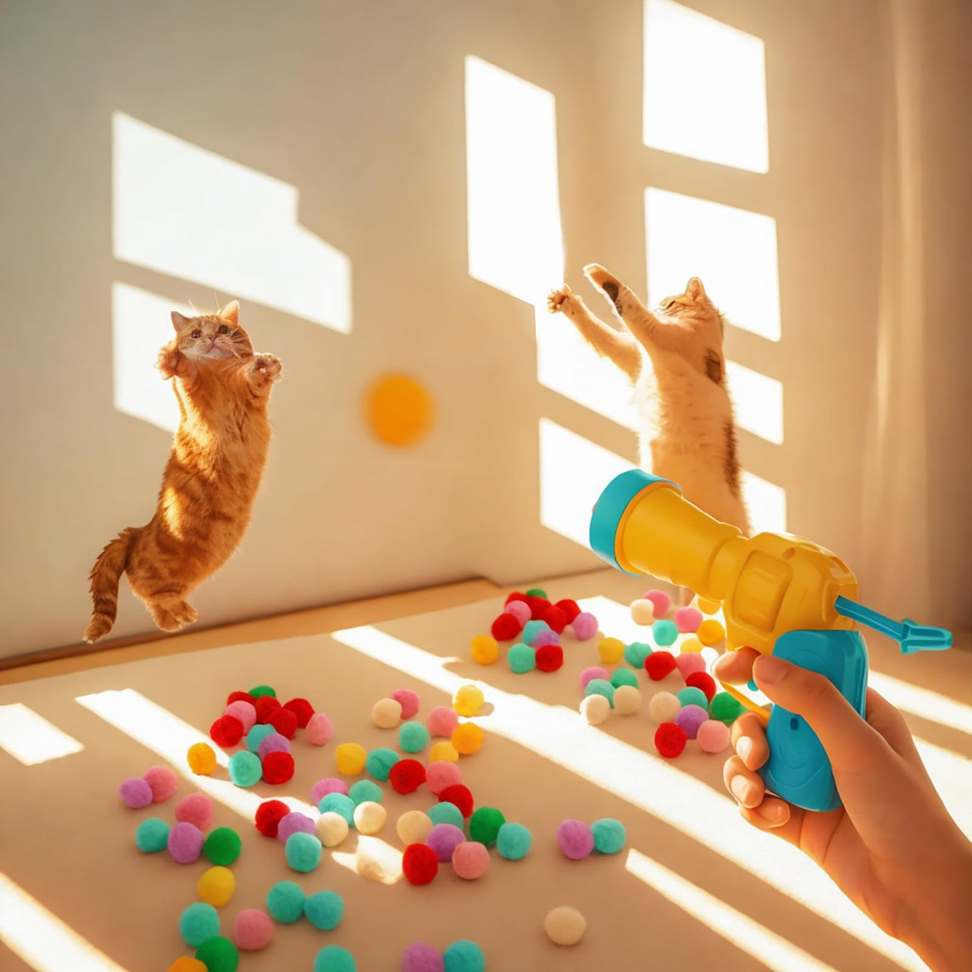 Our Cat Balls Toy With A Launcher Adds An Exciting And Dynamic Element To Playtime, Providing Both Physical Exercise And Mental Stimulation For Your Cat. It'S A Great Way To Engage With Your Furry Companion And Create Memorable Play Moments Together. If You Are Busy, You Can Let Them Play With The Soft Cat Pom Pom Balls. If You Are Free, You Can Play With Them By Shooting The Balls For Your Furrry Friends, Which Can Strongthen Your Relationship.Interactive Cat Ball Launcher