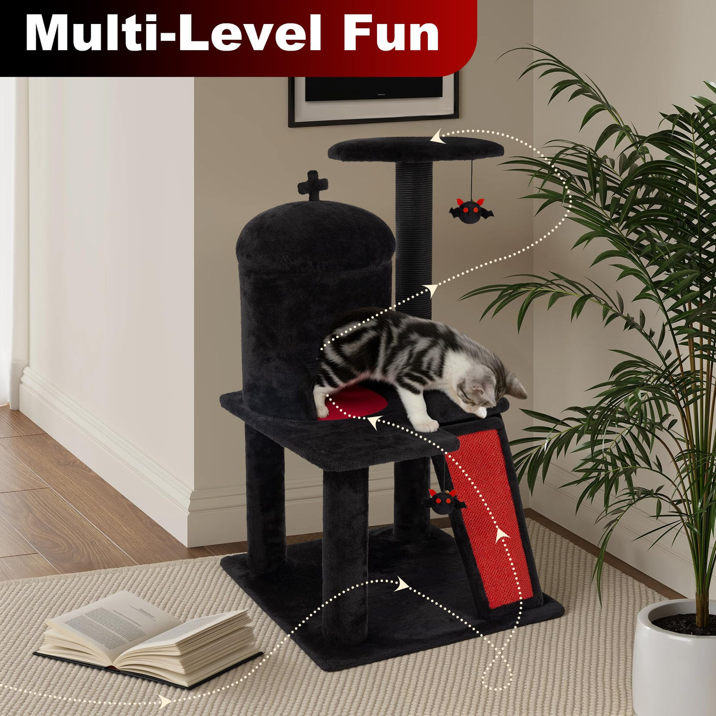 Kamaboko Gothic Cat Tree, 36.5In Black Cat Tower With Coffin Bed, Big Tall Cat Condo With Sisal Scratching Posts, Scratching Ram